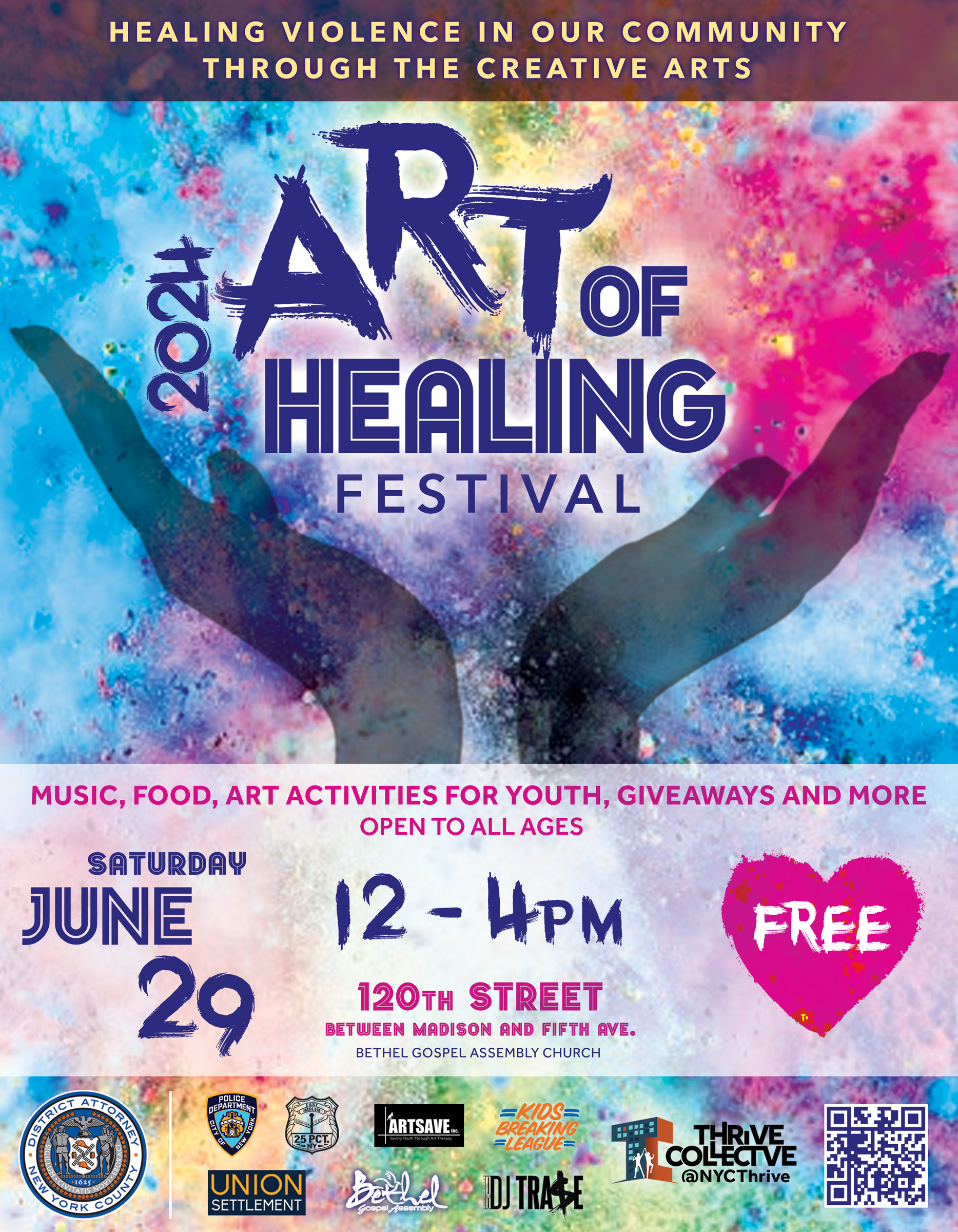 Presented in collaboration with the Manhattan District Attorney, Bethel Gospel Assembly, Union Settlement, DJ Trase, Kids Breaking League, Arts Ave, RHYME, NYPD 25th Precinct, and many more.
