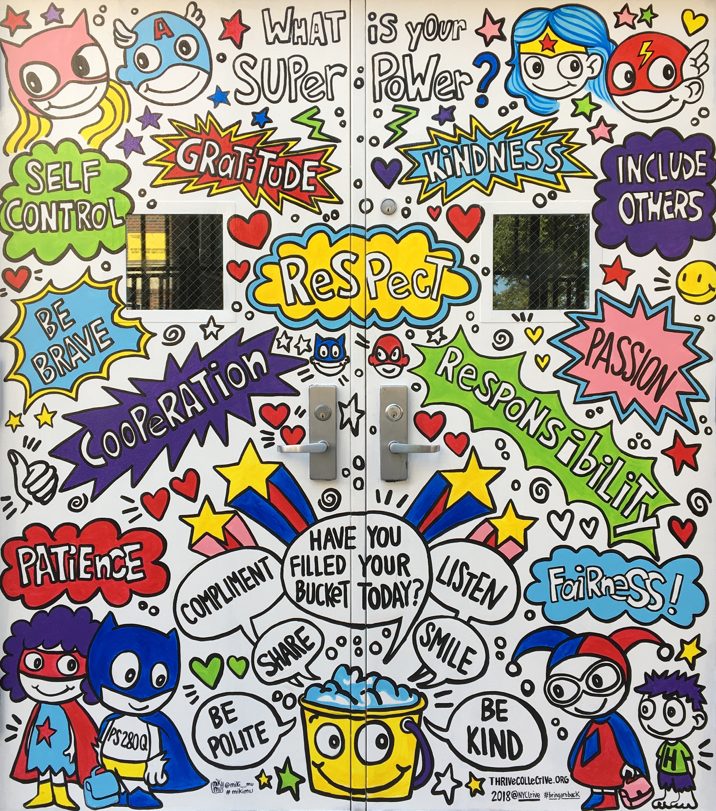 Our final School Murals project of 2018, completed on the eve of the new school year, features two murals “Superpowers” and “Serve with Heart” at the entrance of PS 280Q in Jackson Heights, Queens. We are grateful for new friends and collaborators Principal Lisa Hidalgo and Guidance Counselor Danielle Lammering, and join them in welcoming all 1.1 million NYC public school children, 75,000 teachers, and countless administrators, custodians, and support staff back to school today!