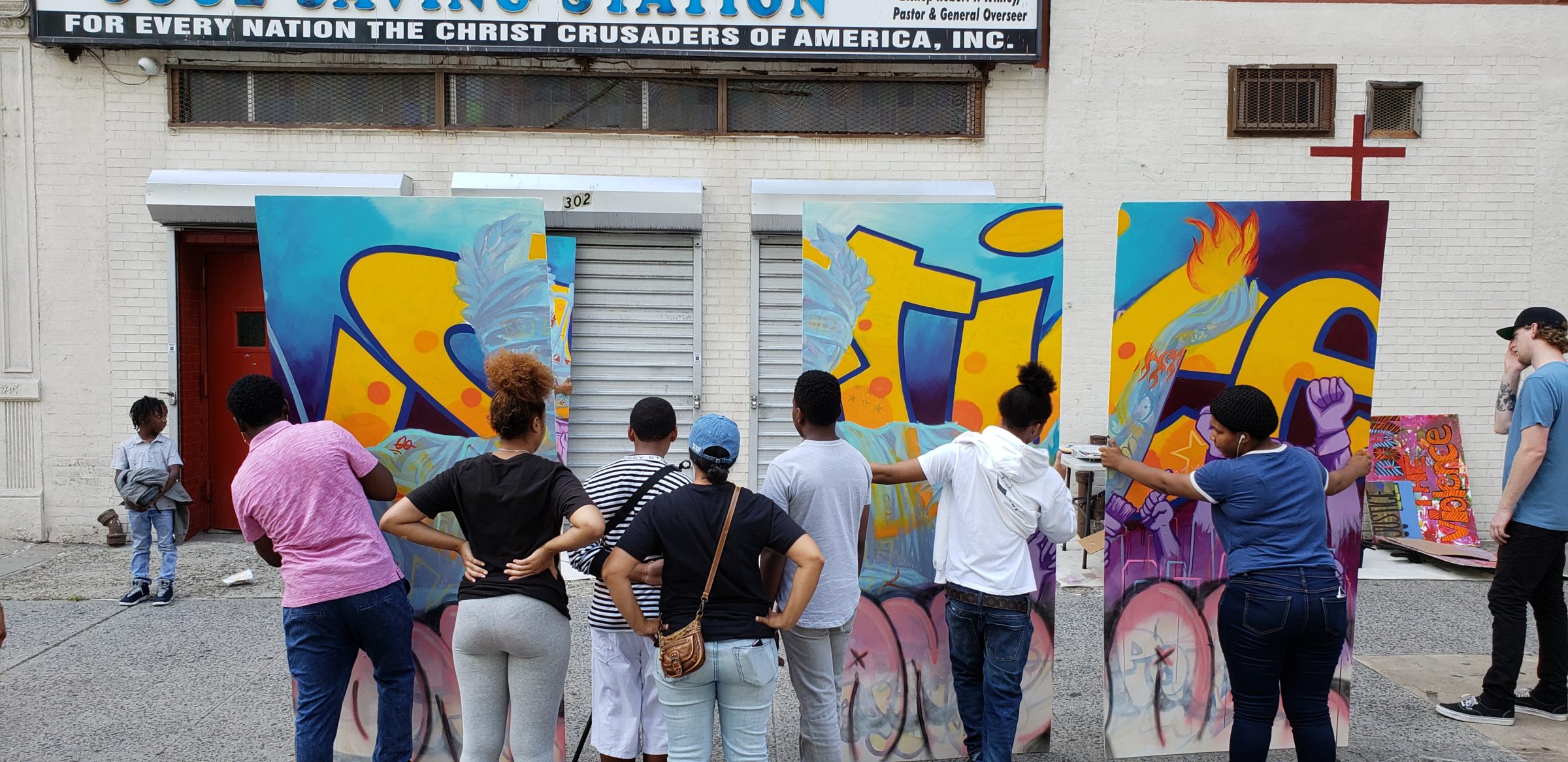 Today, we took filming outside. We spent the morning outside of the Harlem Hub filming our hardworking mural students painting and detailing their artwork. The students also reenacted placing the mural on the side of the building piece by piece. Christine and Randy helped direct the production, guiding students with their roles and assisting them in the video shoot. Students danced or filmed in front of the mural with their song playing in the background as onlookers marveled at the sight.