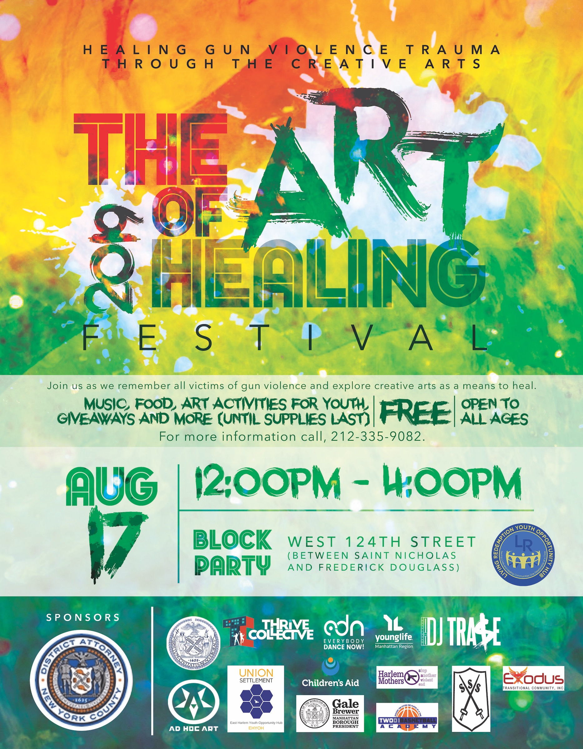 The Art of Healing Festival is now officially a series! The second festival of 2019 comes to West 124th Street in Central Harlem on Saturday, August 17, 2019. Join us as we remember victims and survivors of gun violence and explore creative arts as a means to heal.