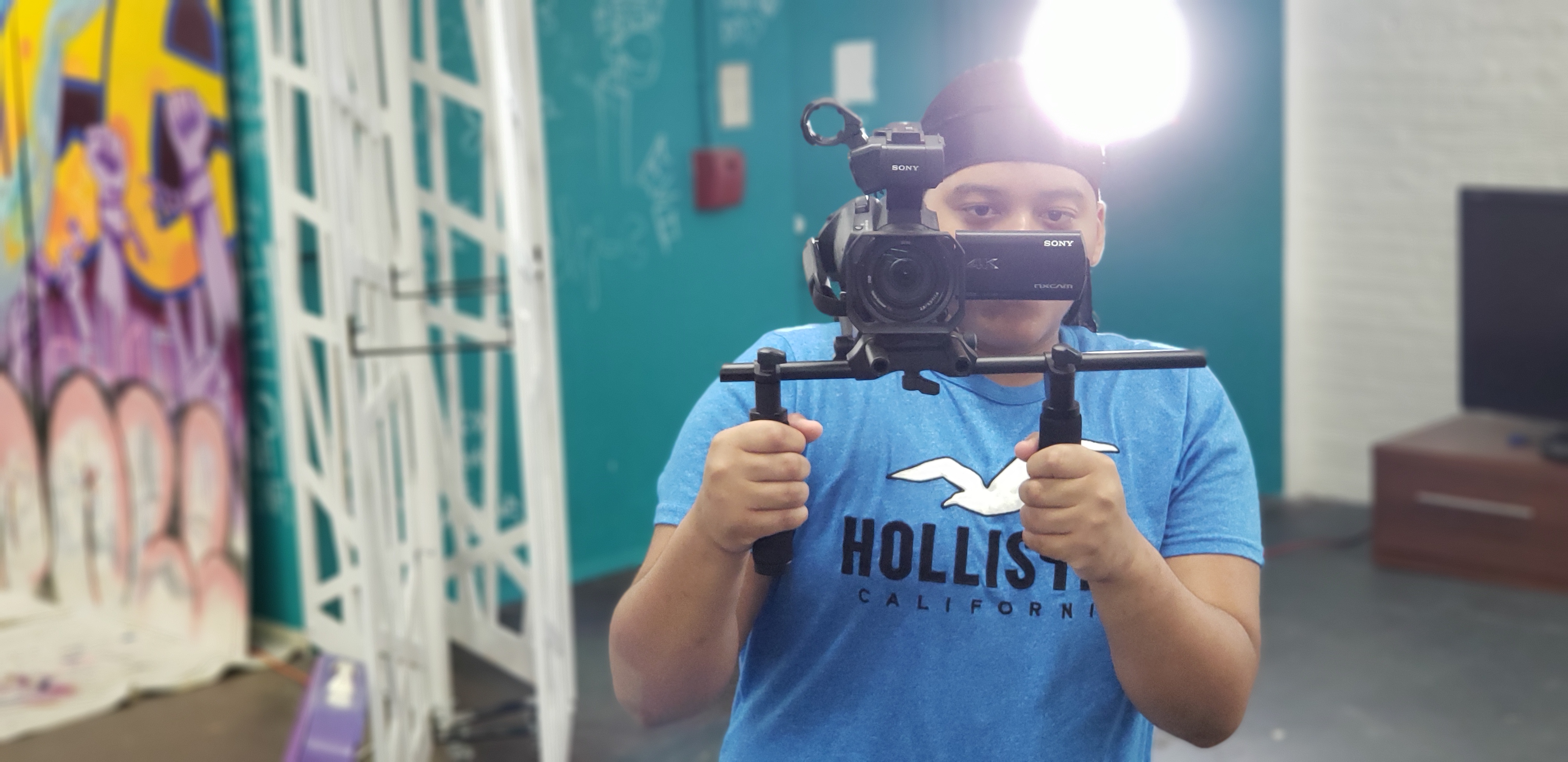 She led the class out to the main room after her explanations, where she had the interns set up the lighting equipment and the stabilizer for the camera. After passing around the equipment to each of the students to let them get a feel of the machinery, Christine adjusted the lights and had each student practicing and experimenting with different effects with the recording function. Other students who were not recording were being filmed dancing to music and each person had their turn to either dance or become a filming crew person for the day. I had the opportunity to film some of our younger students dance and can I say, they can move!