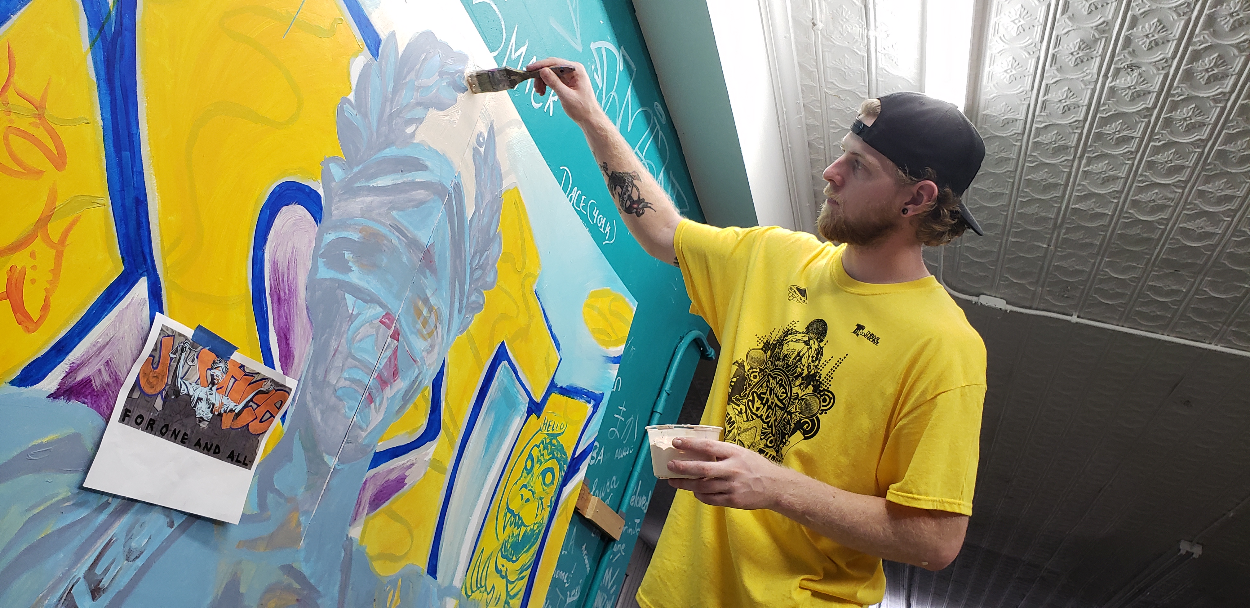 Another start to a wonderful day! Marissa and Uhey began this morning touching up the “For One and All” mural and painting the backdrop. They blended colors together to create a fade effect and applied washes to coat the mural and protect it from dust.