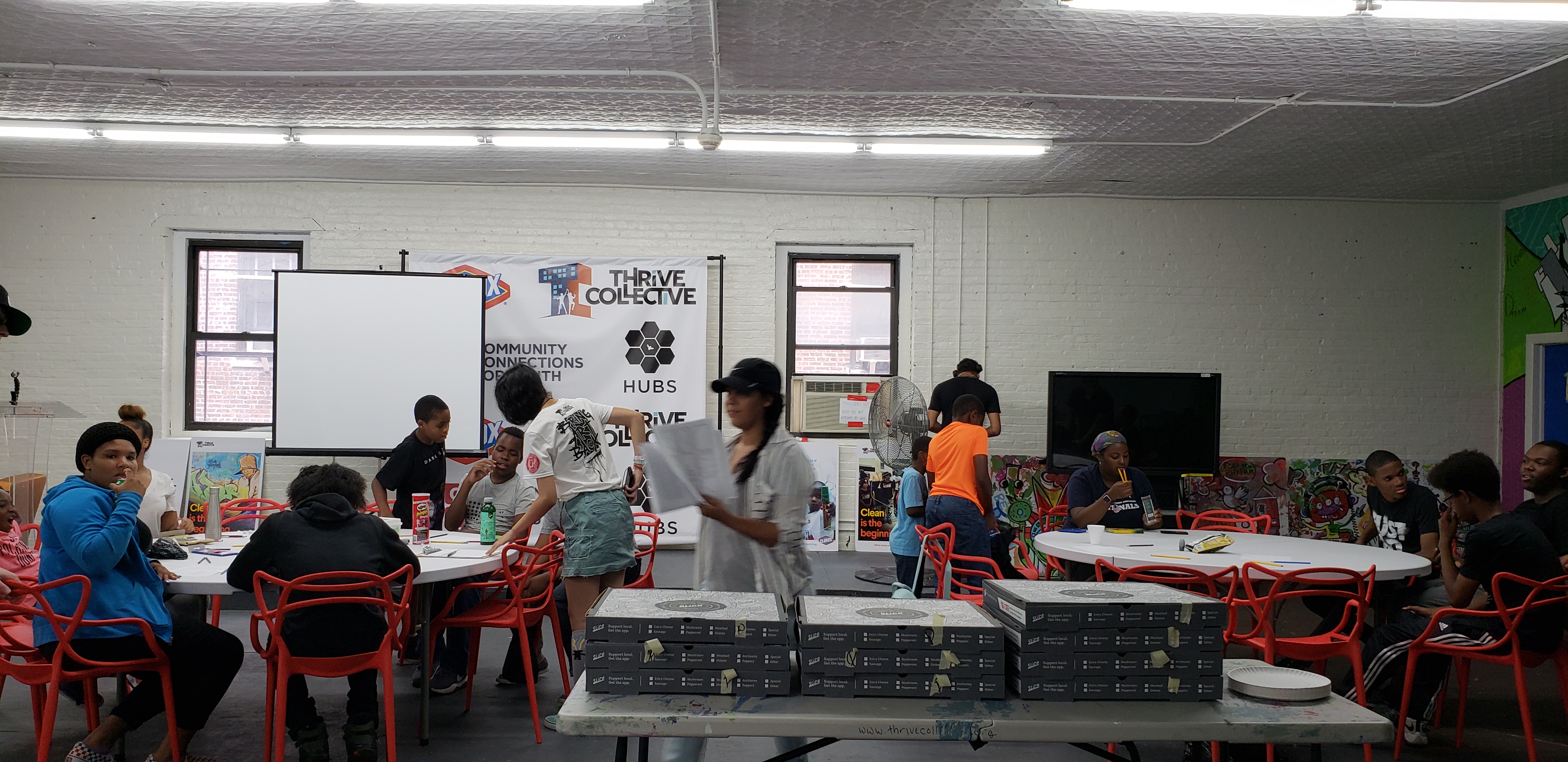 Afterwards, we discussed elements of these videos and how to incorporate them into something personal for us, including filmmaking techniques like time lapse, lighting effects, camera pans, dance moves, sets and locations. By lunchtime we were talking about fades and colors and other transition methods, but the smell of pizza had the final say in our discussion. We took a break so everyone could refuel on some delicious slices and ice cold lemonade.