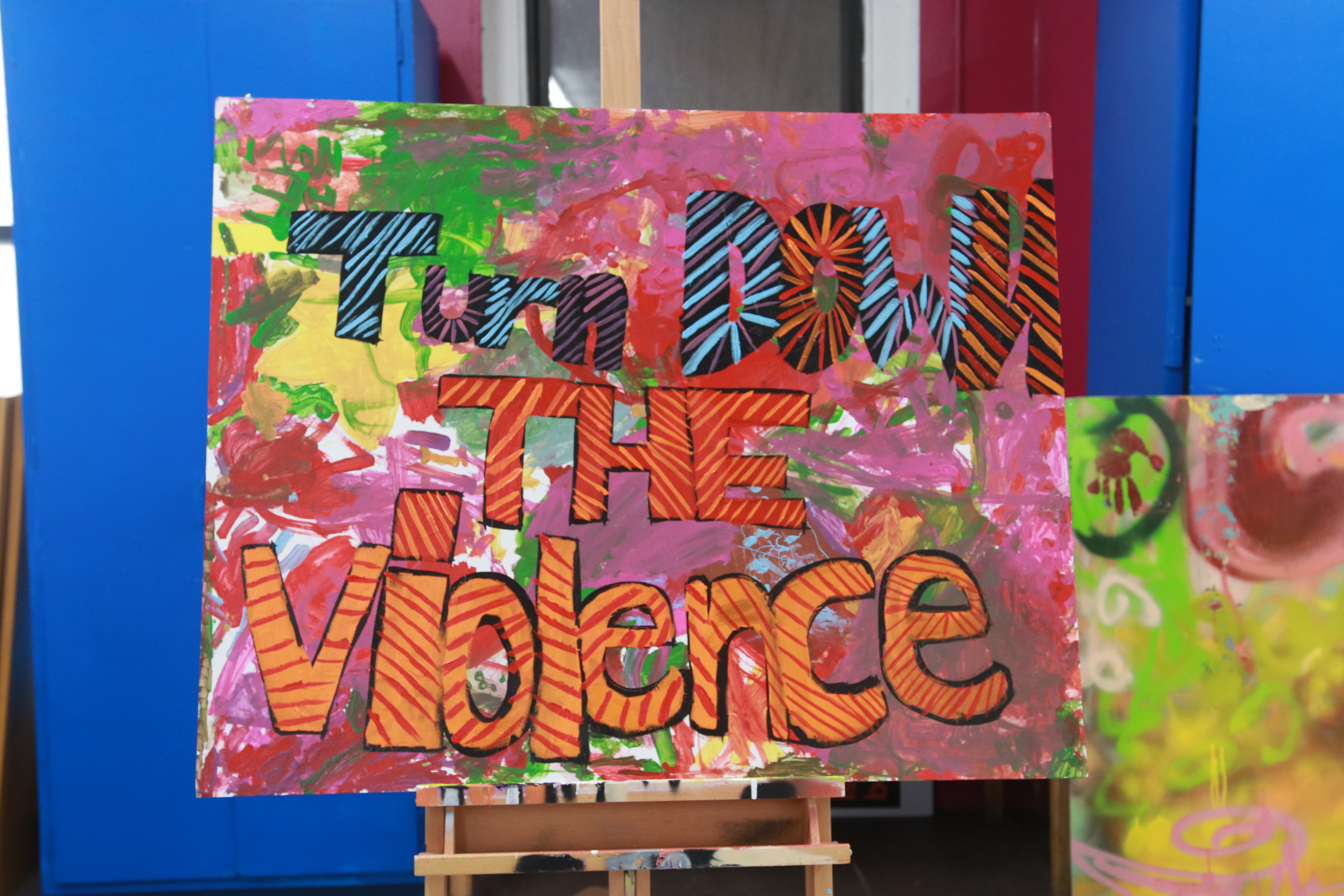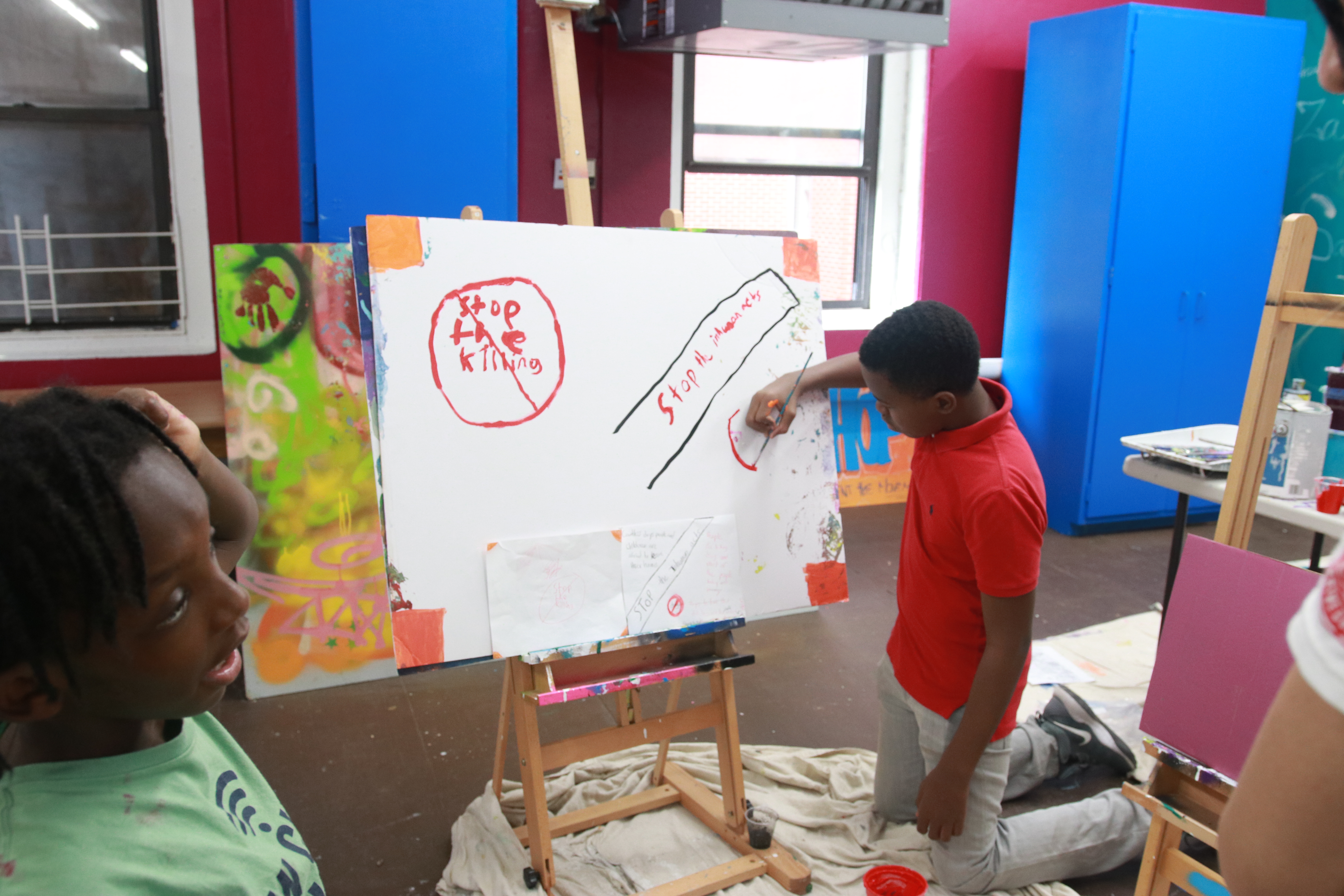 As the director of the music video we are filming tomorrow, Christine worked with our Murals and Dance instructors today to make sure we’re ready for our closeups under the bright lights. To begin, our younger students and siblings sketched, and later painted signs for the music video. Our interns and Christine directed the kids to draw various statement signs and slogans onto prepared white boards.