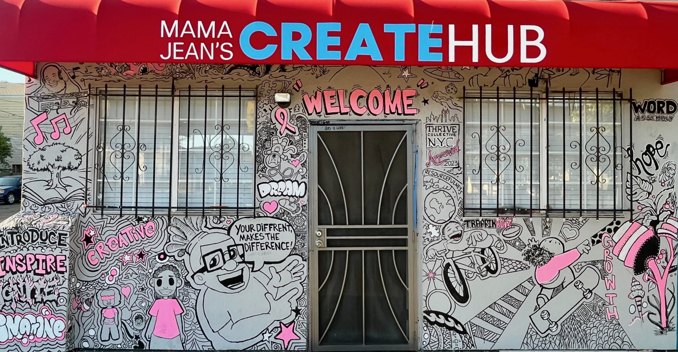 On April 16, 2023, we were proud to celebrate two new murals and the soft launch of Mama Jean’s Create Hub in West Oakland with our Oakland City Coordinator De’Morea “Truck” Evans, Thrive Creative Director Kekoa, veteran teaching artist Kristen Hubbard, School Partners USA 2022 cohort members and alumni, and scores of friends and colleagues from the neighborhood.