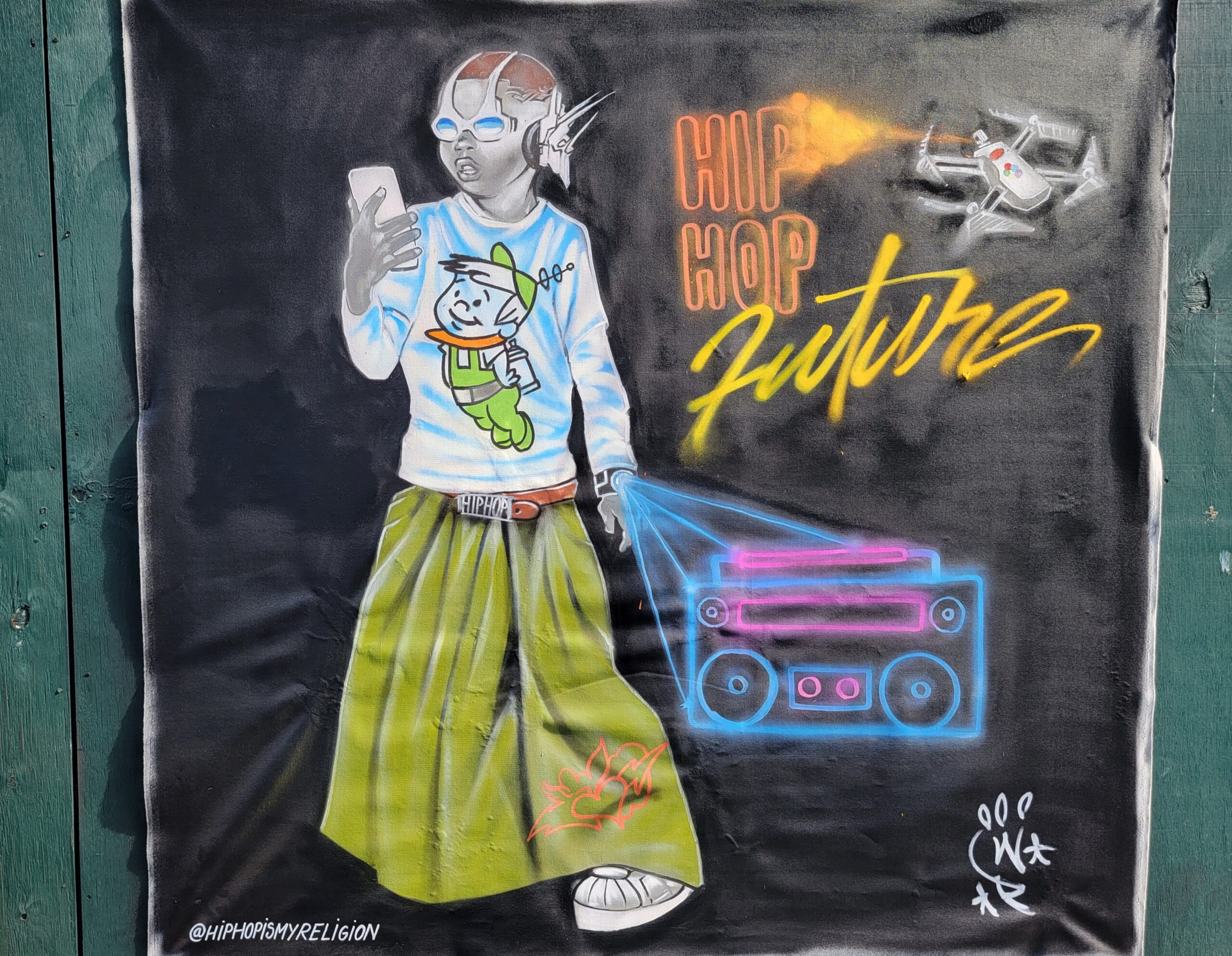 Hip Hop artistry beautifies public spaces and brings art to the masses. The first element of Hip Hop to captivate public imagination was the visual artistry of Graffiti. The Hip Hop 50th Birthday Jam paid tribute to the transformative power of Hip Hop visuals with six canvas works by iconic Graf Writers, and two collaborative murals with party goers painting alongside their heroes. Together, they memorialized the movement. Eight completed pieces depict five decades and the future of Hip Hop, plus the power of collaborative public art.