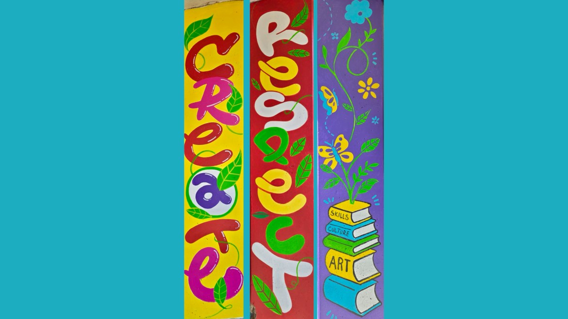 “The Doer” mural design includes a quote by Teddy Roosevelt, “Do what you can, with what you have, where you are.” The style draws inspiration from Mary Blair, who is well known for her work with Disney.