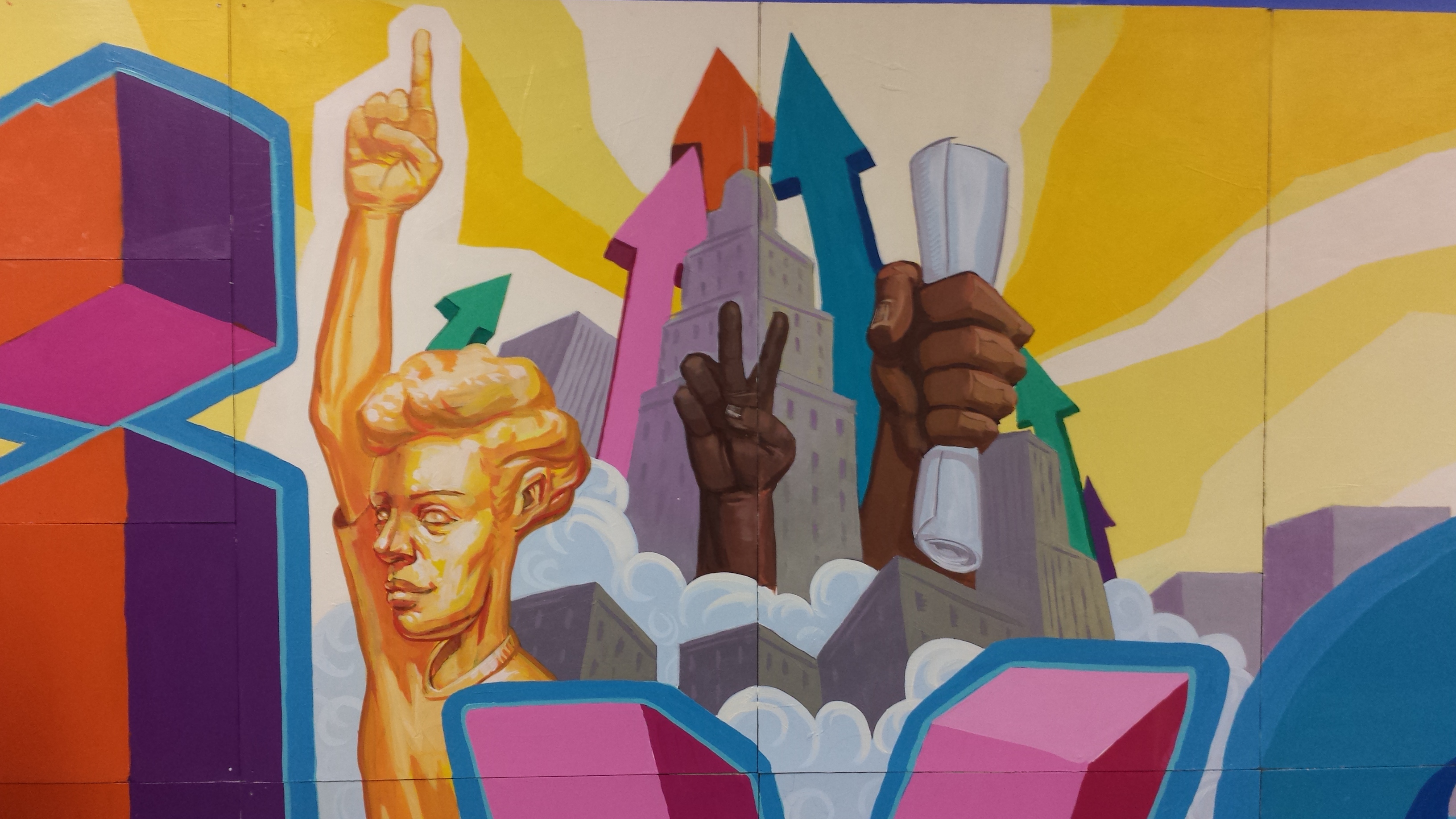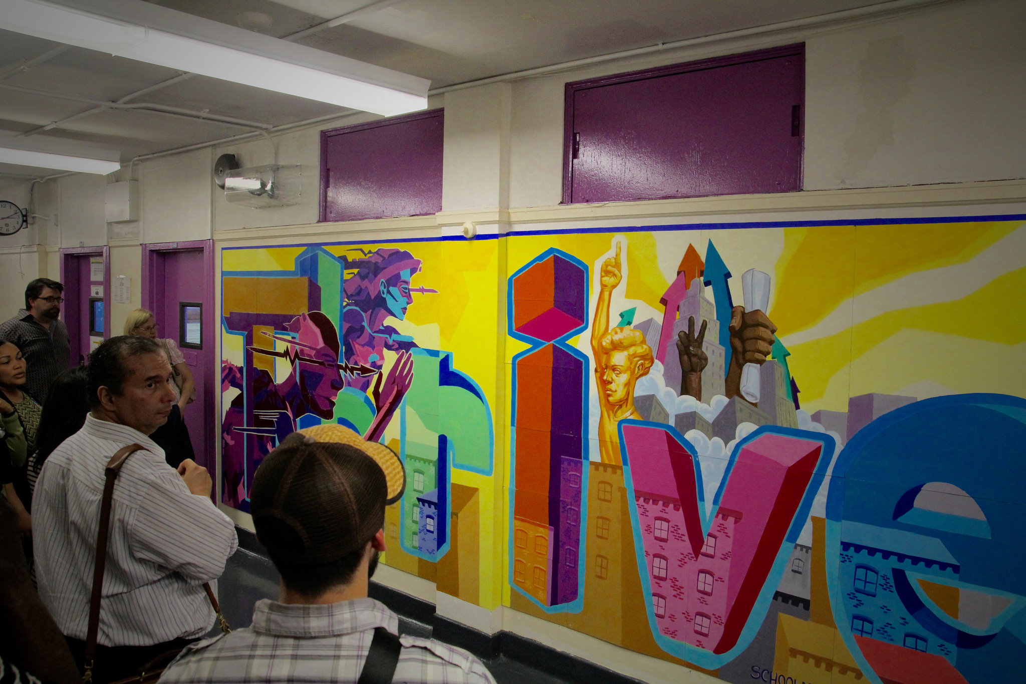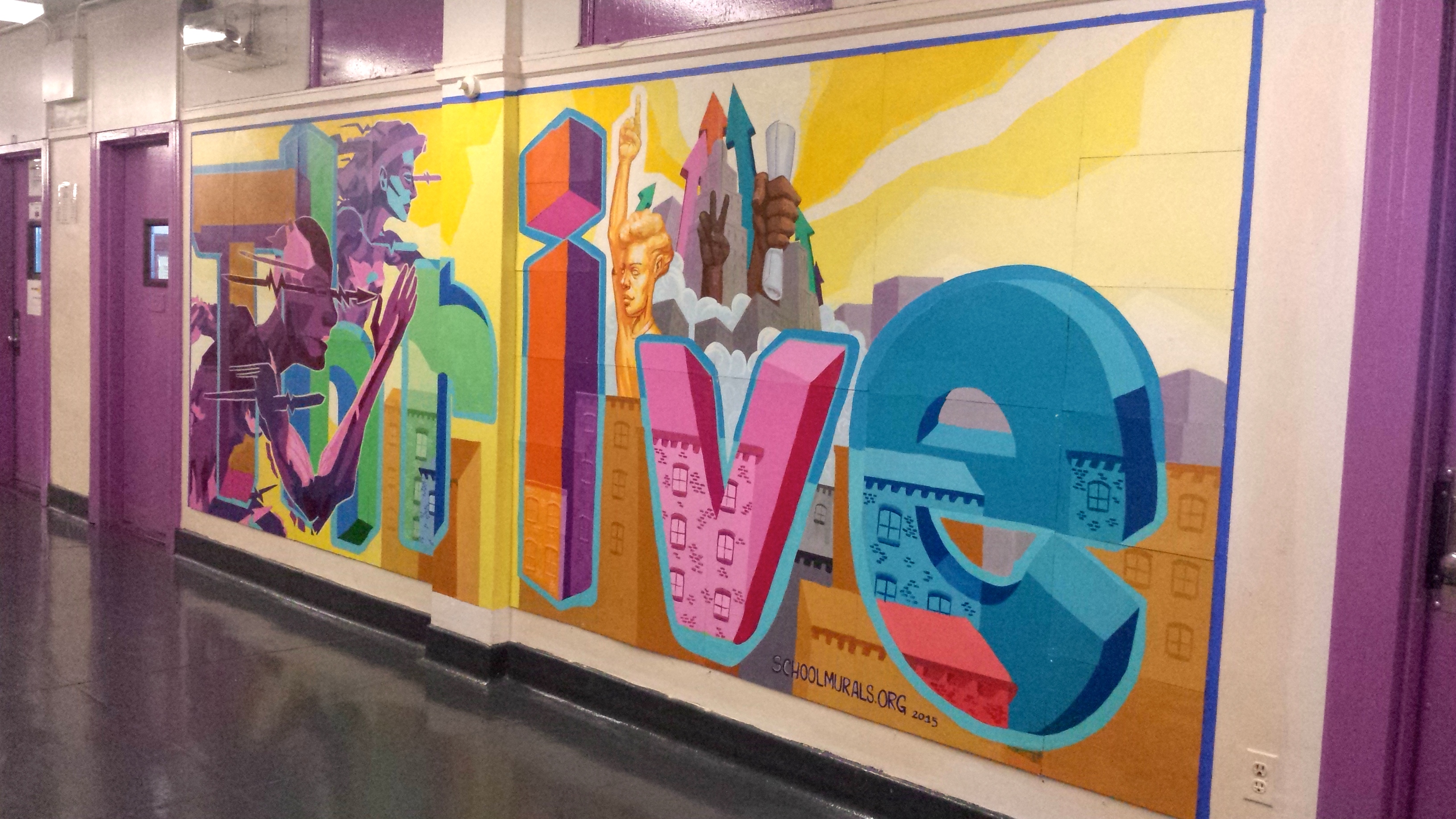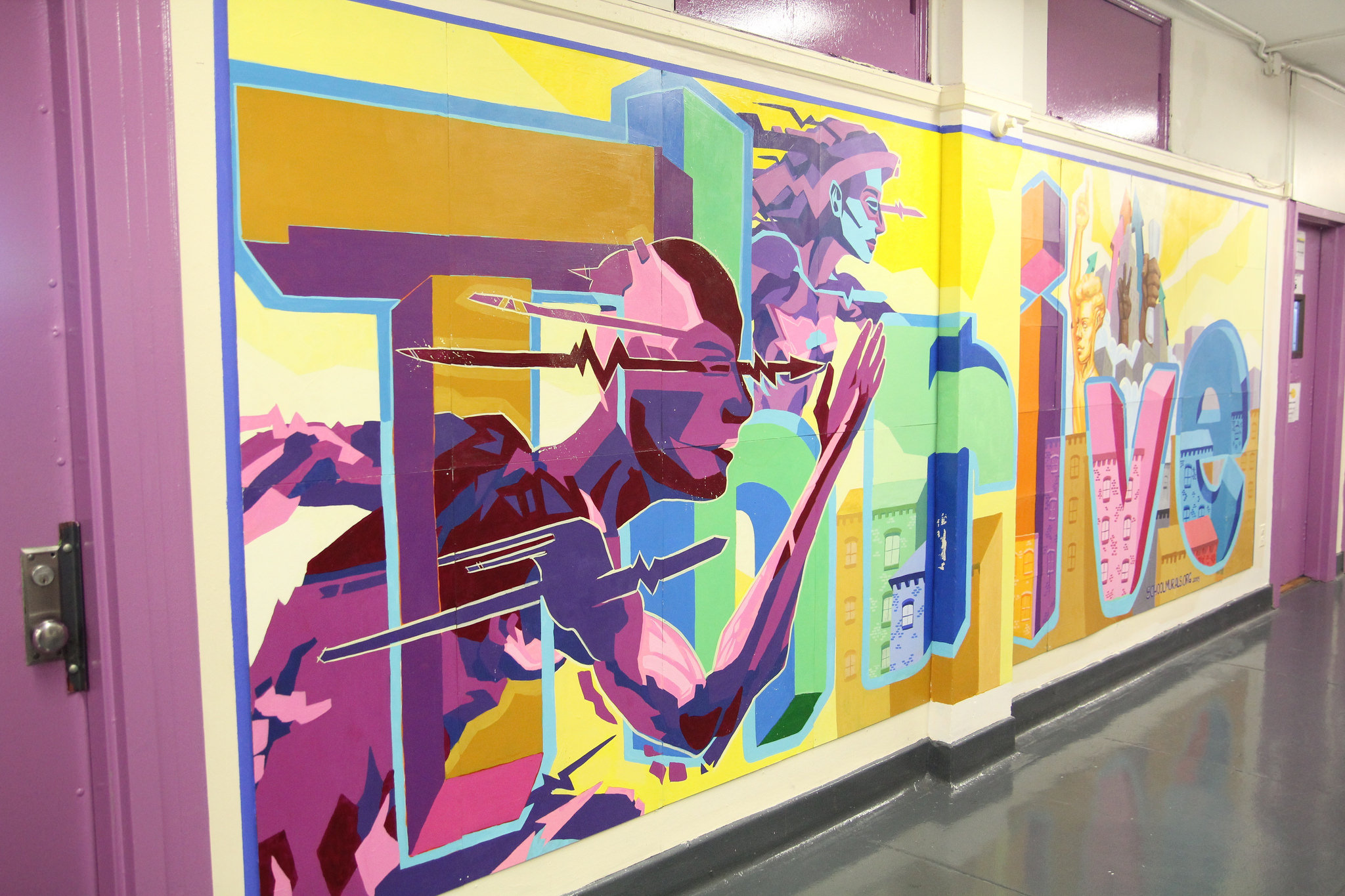 Thrive: East New York Thrive Series (3 of 6) Thomas Jefferson Educational Campus (Brooklyn 2015) • Art Direction & Teaching Artist: Kekoa • Interior lobby • 120 square feet • Acrylic on Gessobord • Collaborating schools: W.A.T.C.H. Academy High School & FDNY High School • 120 students in five art classes