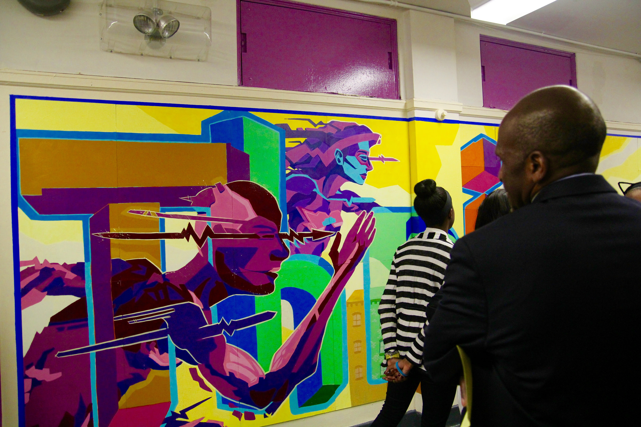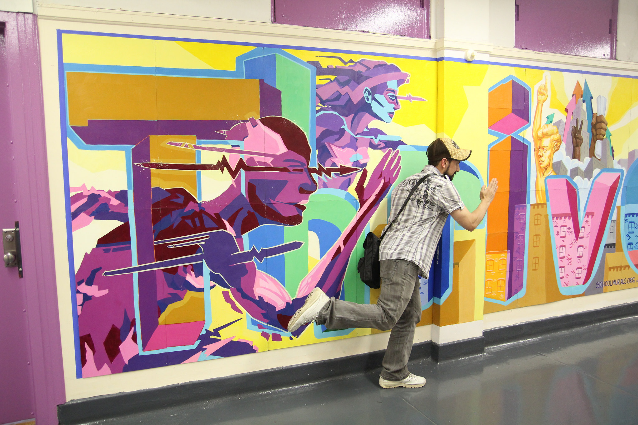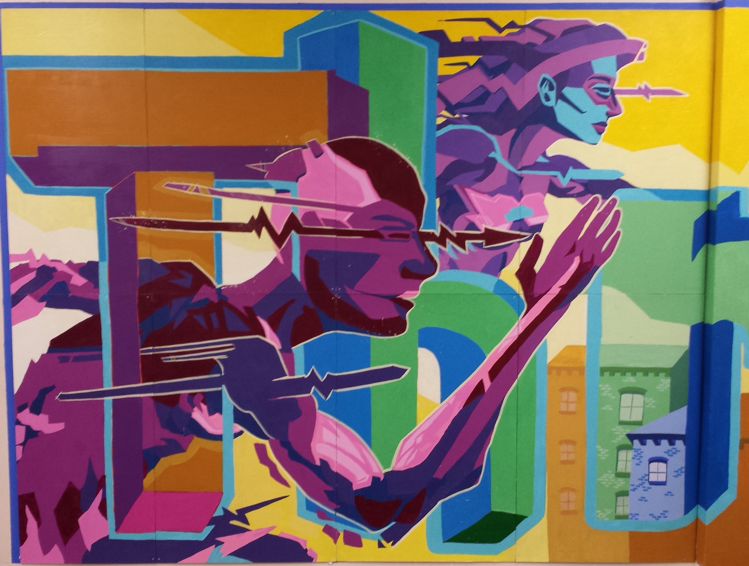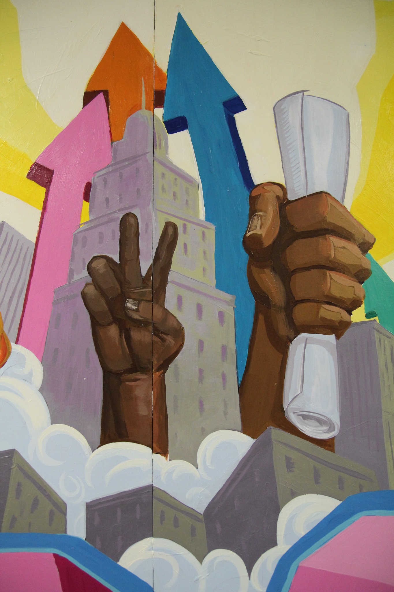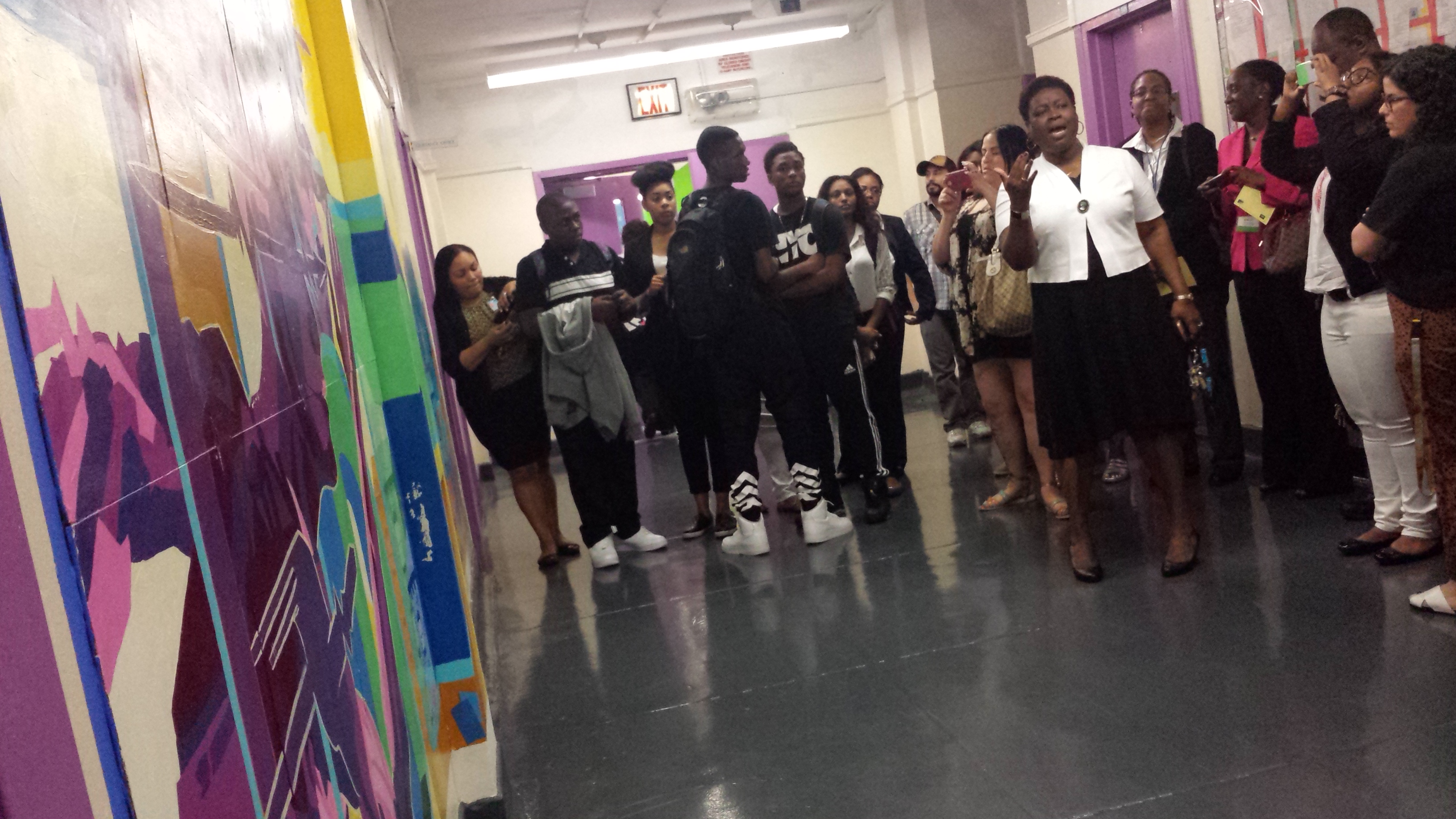 Thrive: East New York Thrive Series (3 of 6) Thomas Jefferson Educational Campus (Brooklyn 2015) • Art Direction & Teaching Artist: Kekoa • Interior lobby • 120 square feet • Acrylic on Gessobord • Collaborating schools: W.A.T.C.H. Academy High School & FDNY High School • 120 students in five art classes