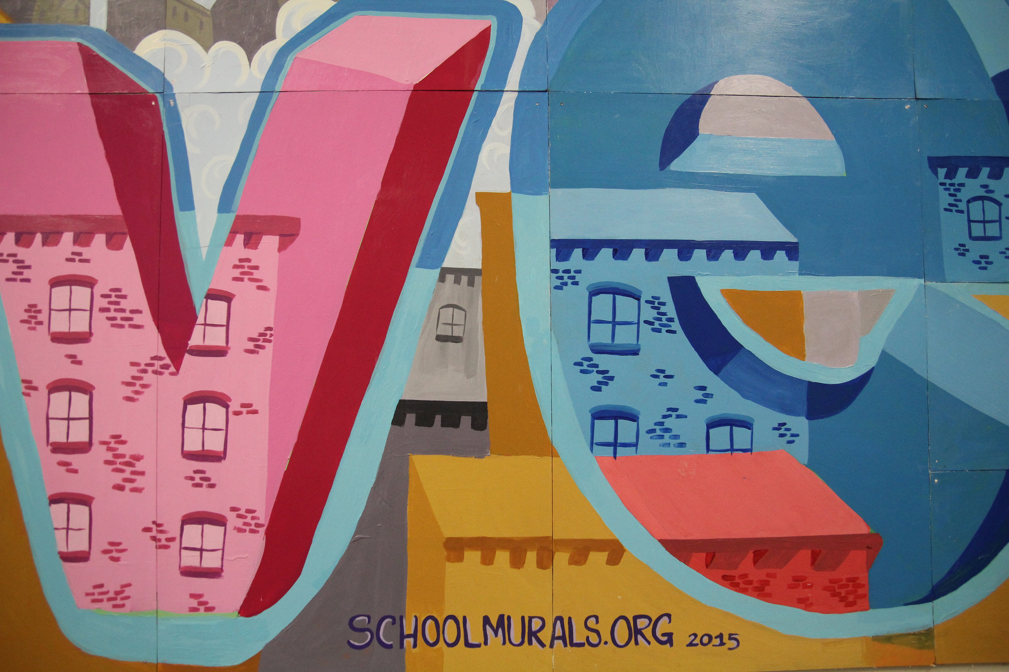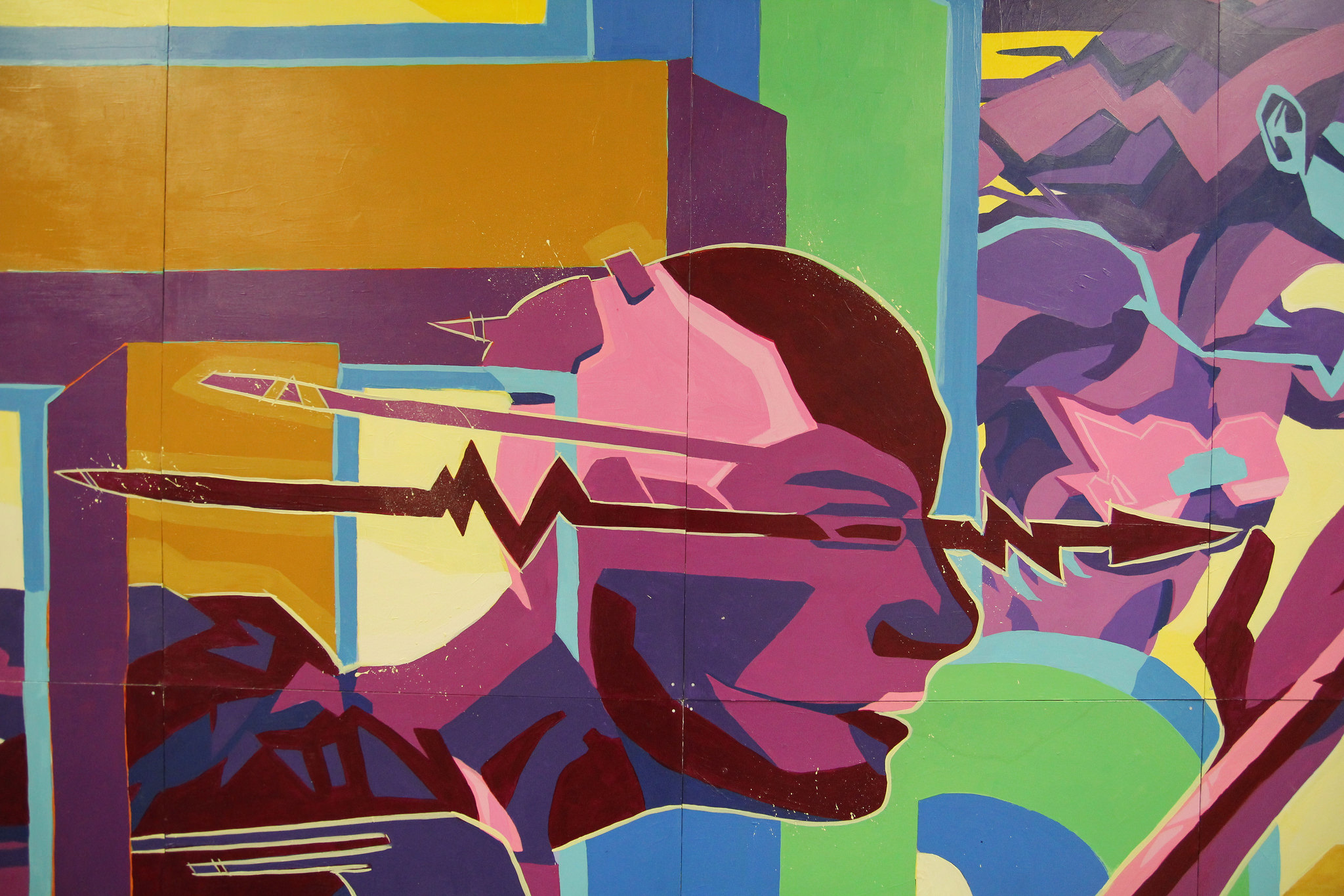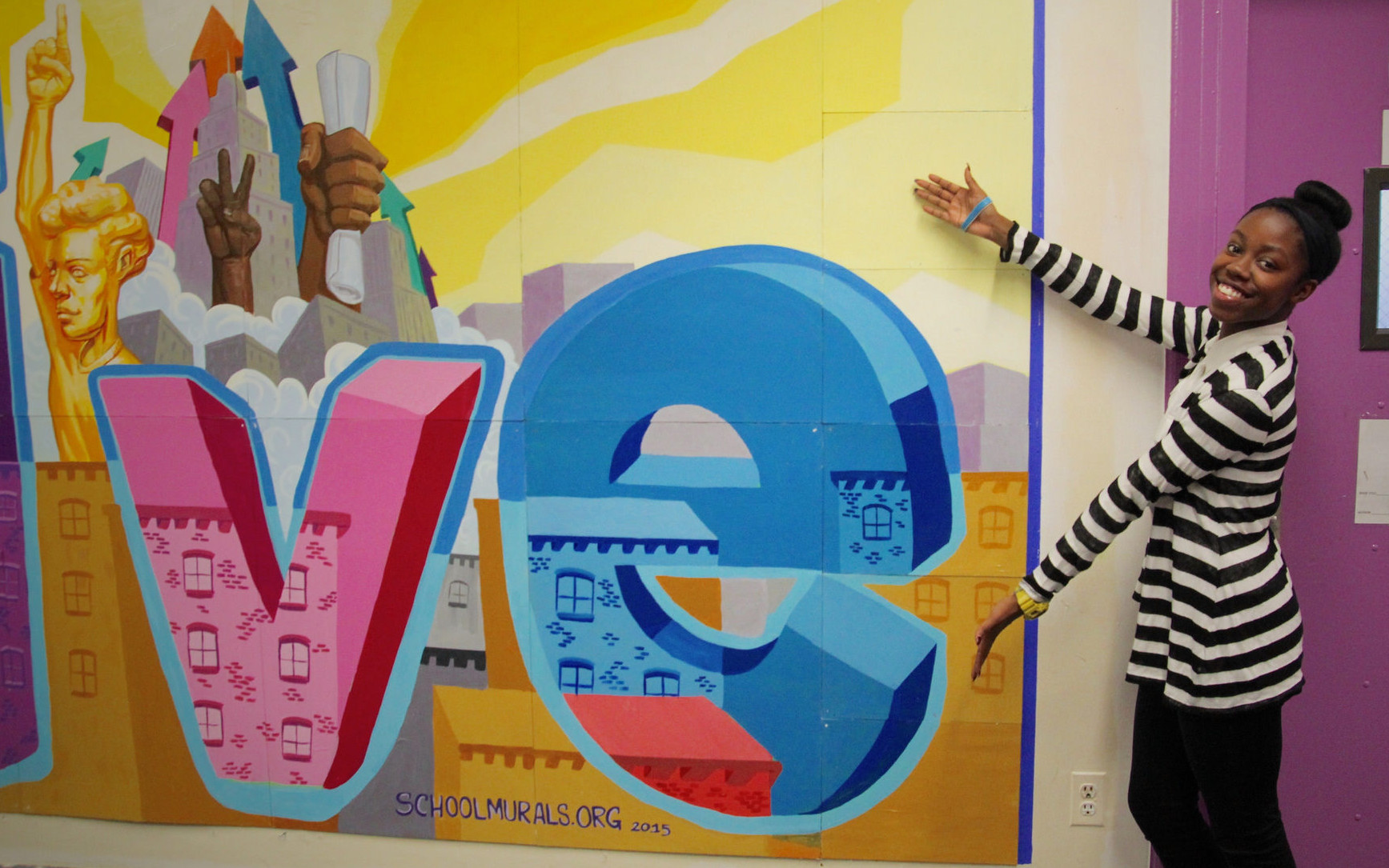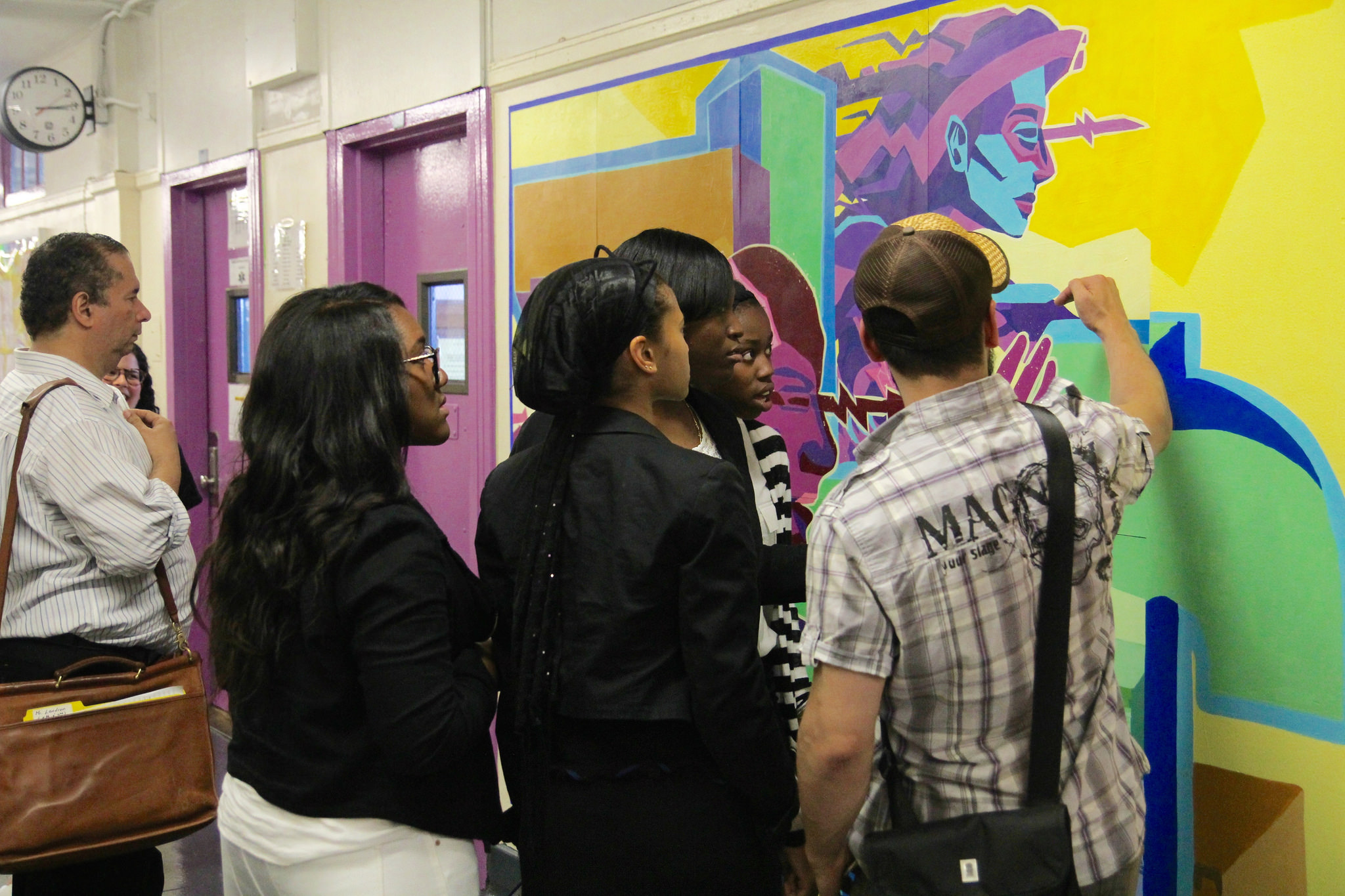 Thrive: East New York Thrive Series (3 of 6) Thomas Jefferson Educational Campus (Brooklyn 2015) • Art Direction & Teaching Artist: Kekoa • Interior lobby • 120 square feet • Acrylic on Gessobord • Collaborating schools: W.A.T.C.H. Academy High School & FDNY High School • 120 students in five art classes