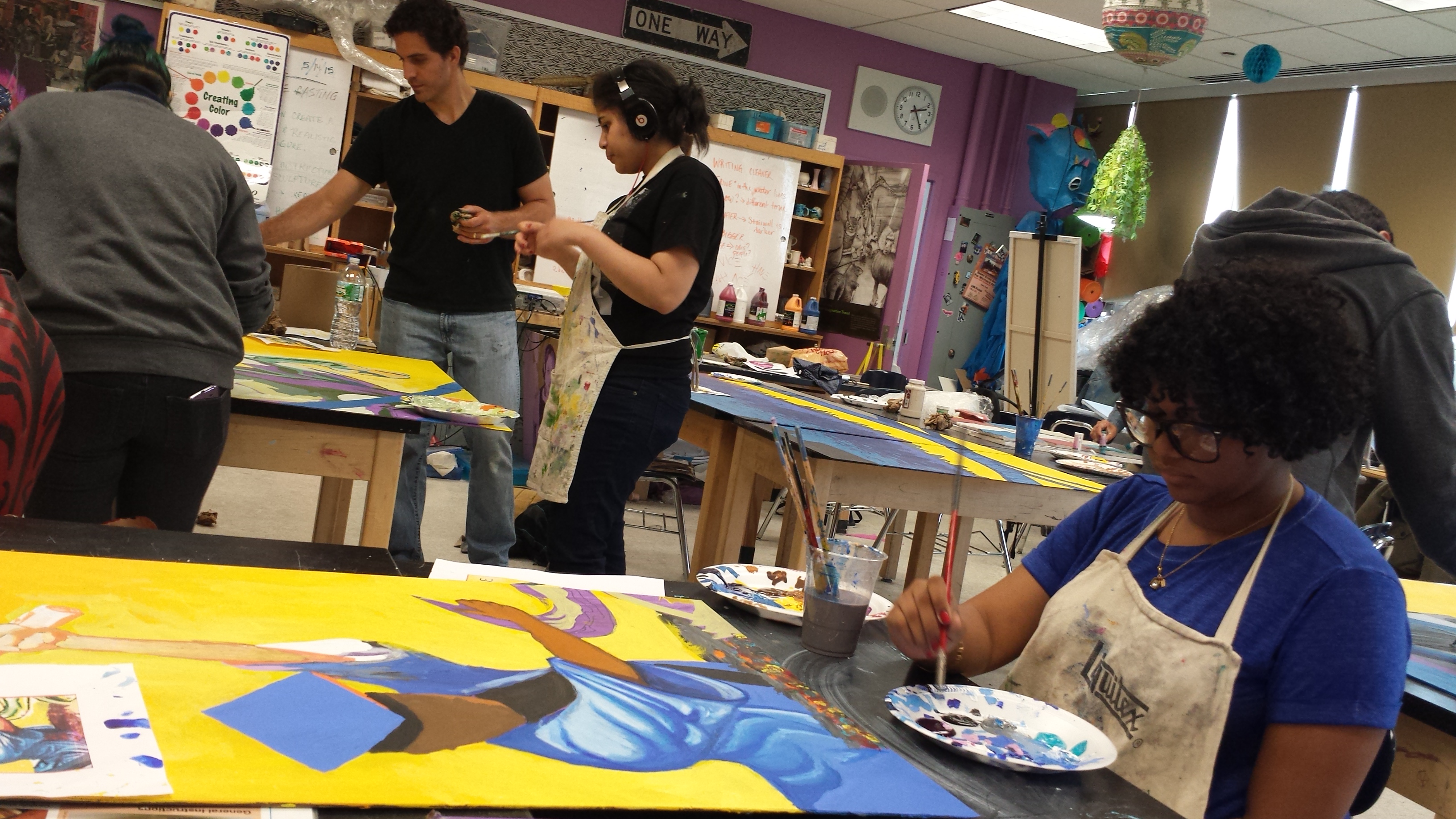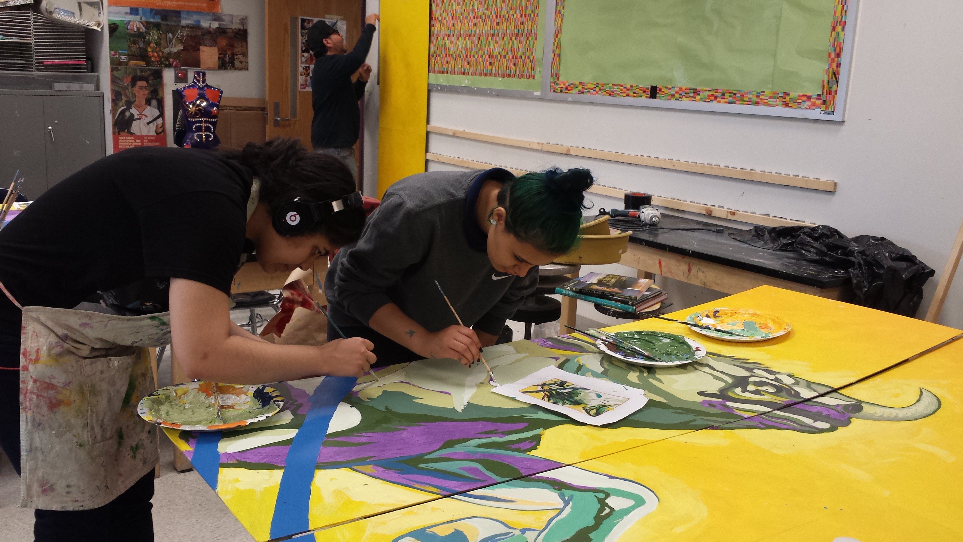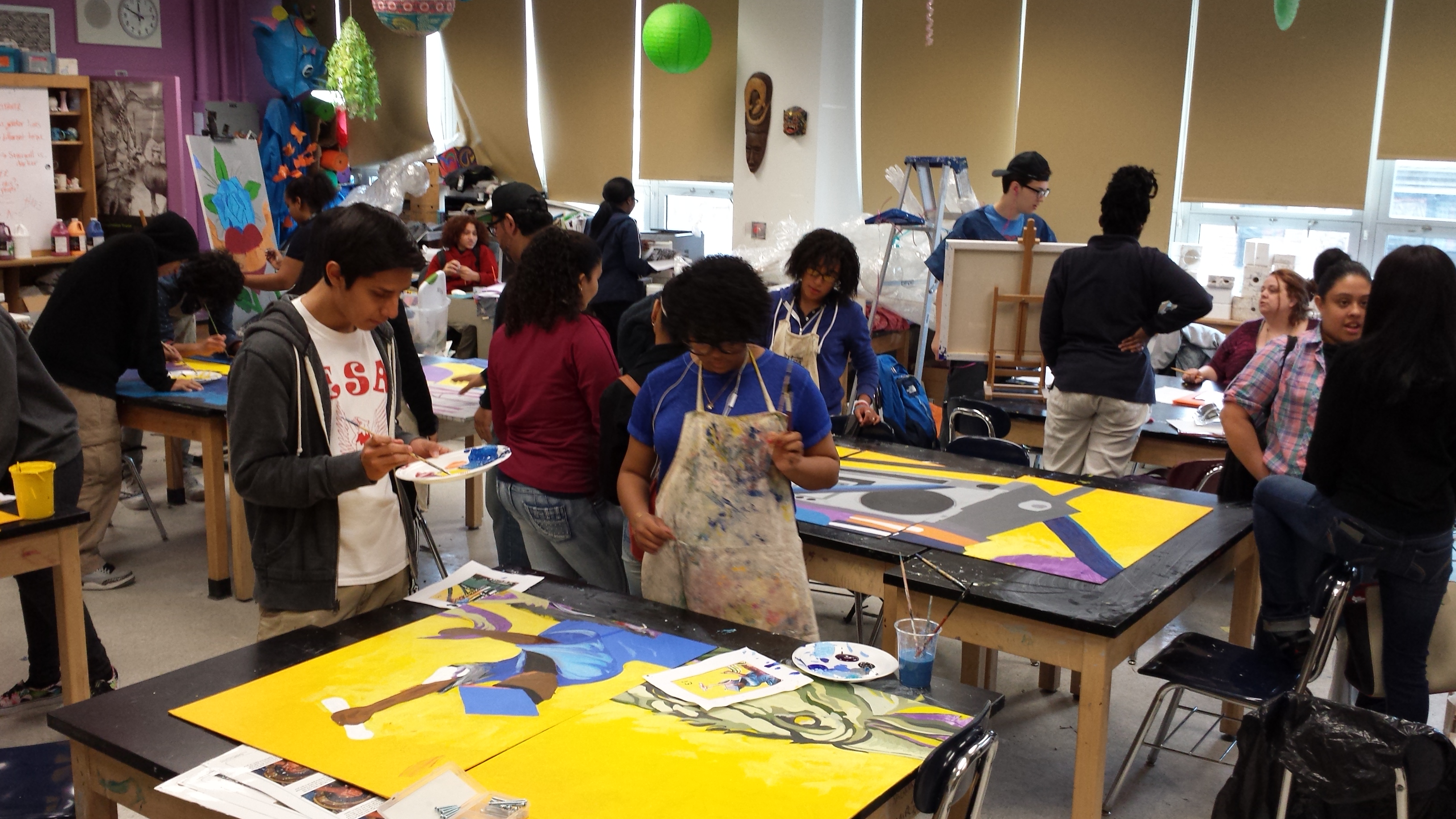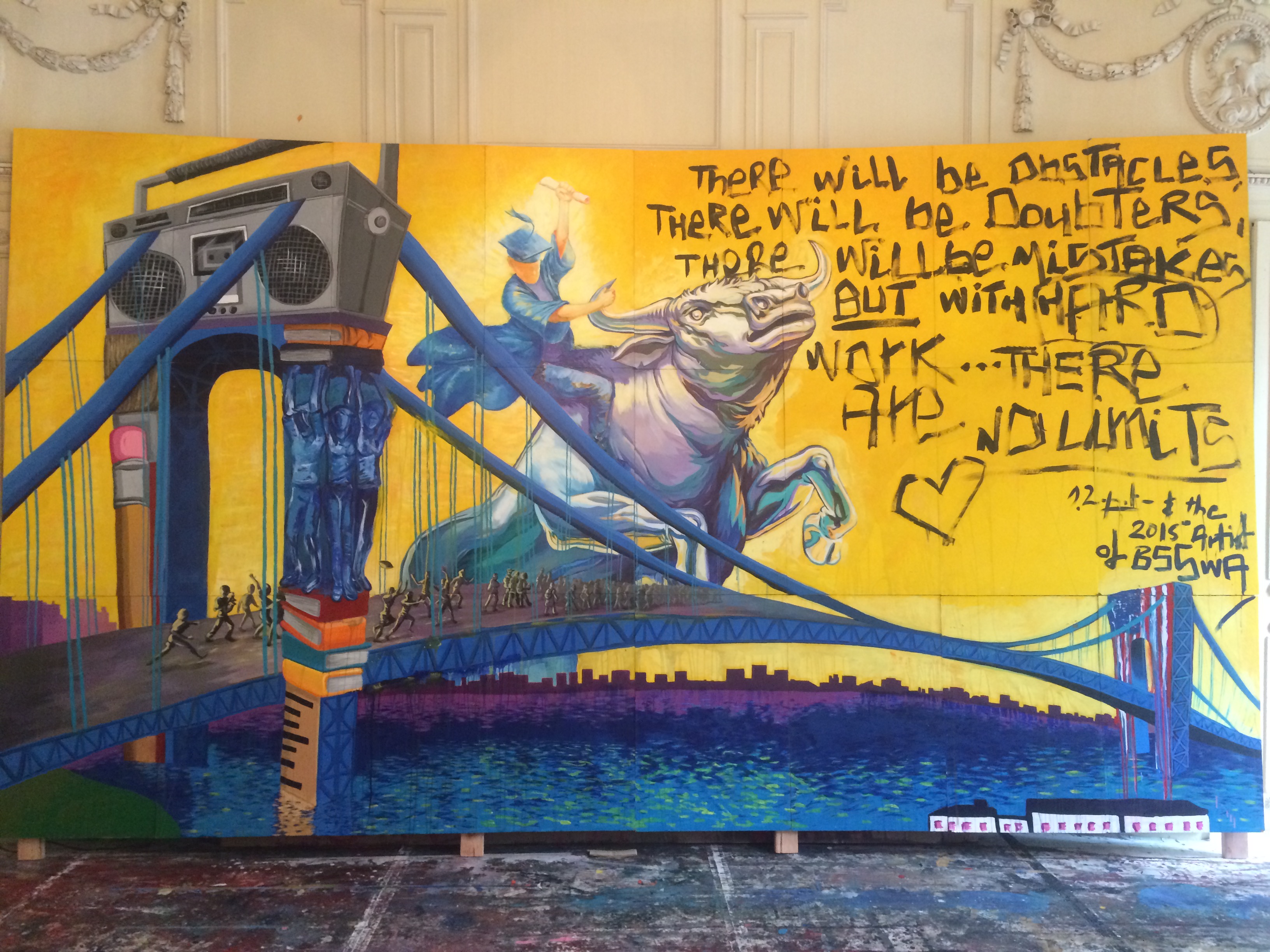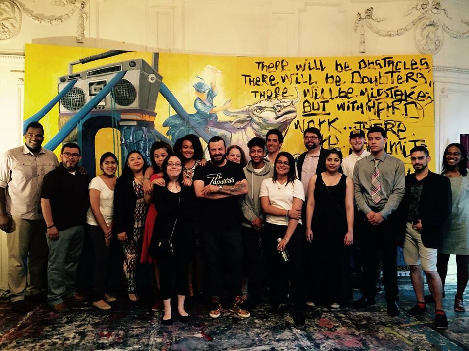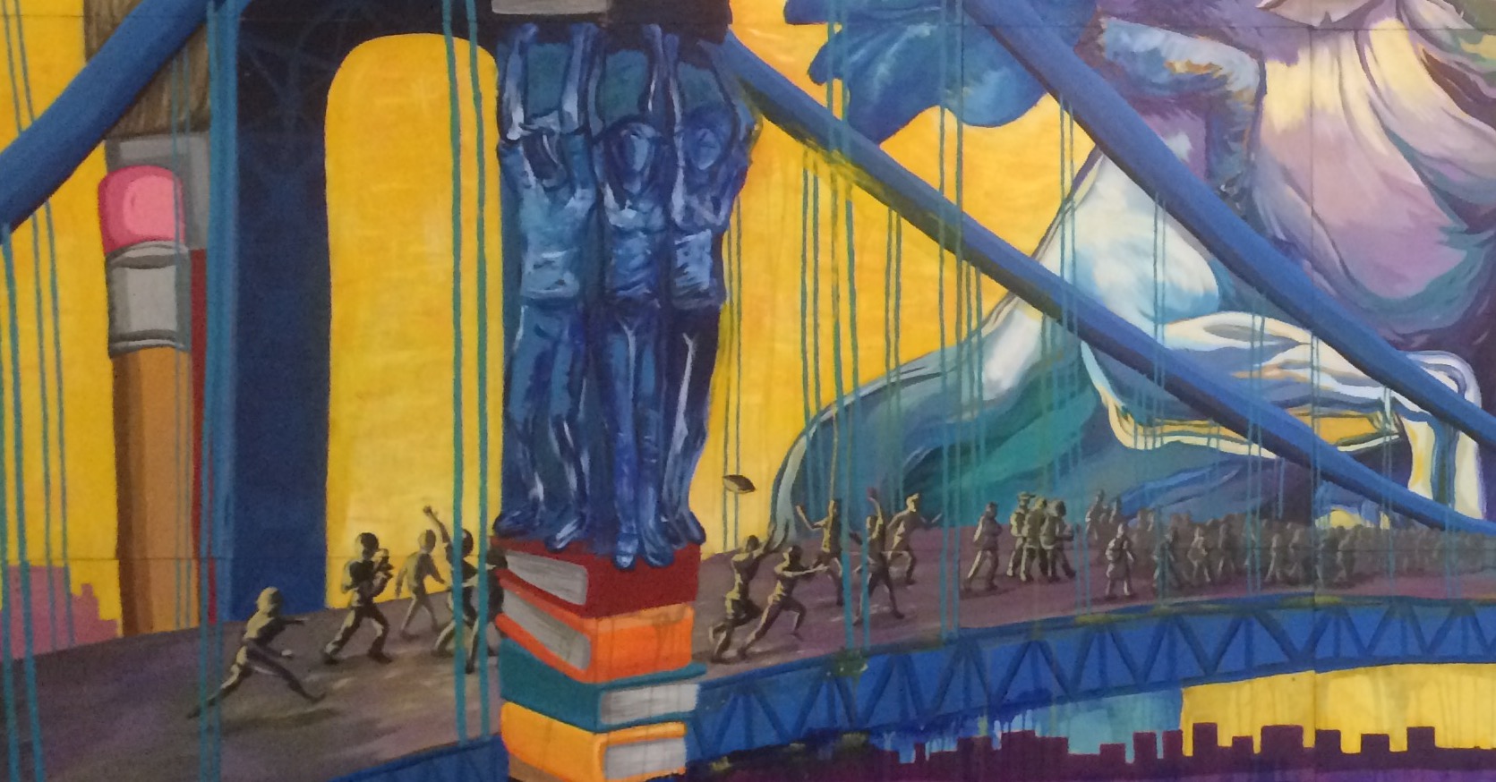Thrive: Hunts Point Thrive Series (5 of 6) Bronx Studio School for Writers and Artists (Bronx 2015) • Art Direction: Domingo Zapata • Teaching Artist: Sam Wisneski • Main stairwell • 120 square feet • Acrylic on Gessobord • Conceived, designed, and produced by Mural: Master Class students • Sponsored by NYC Council Member Maria del Carmen Arroyo, Elevate NYC, Domingo Zapata Studios, and Turkey Hill