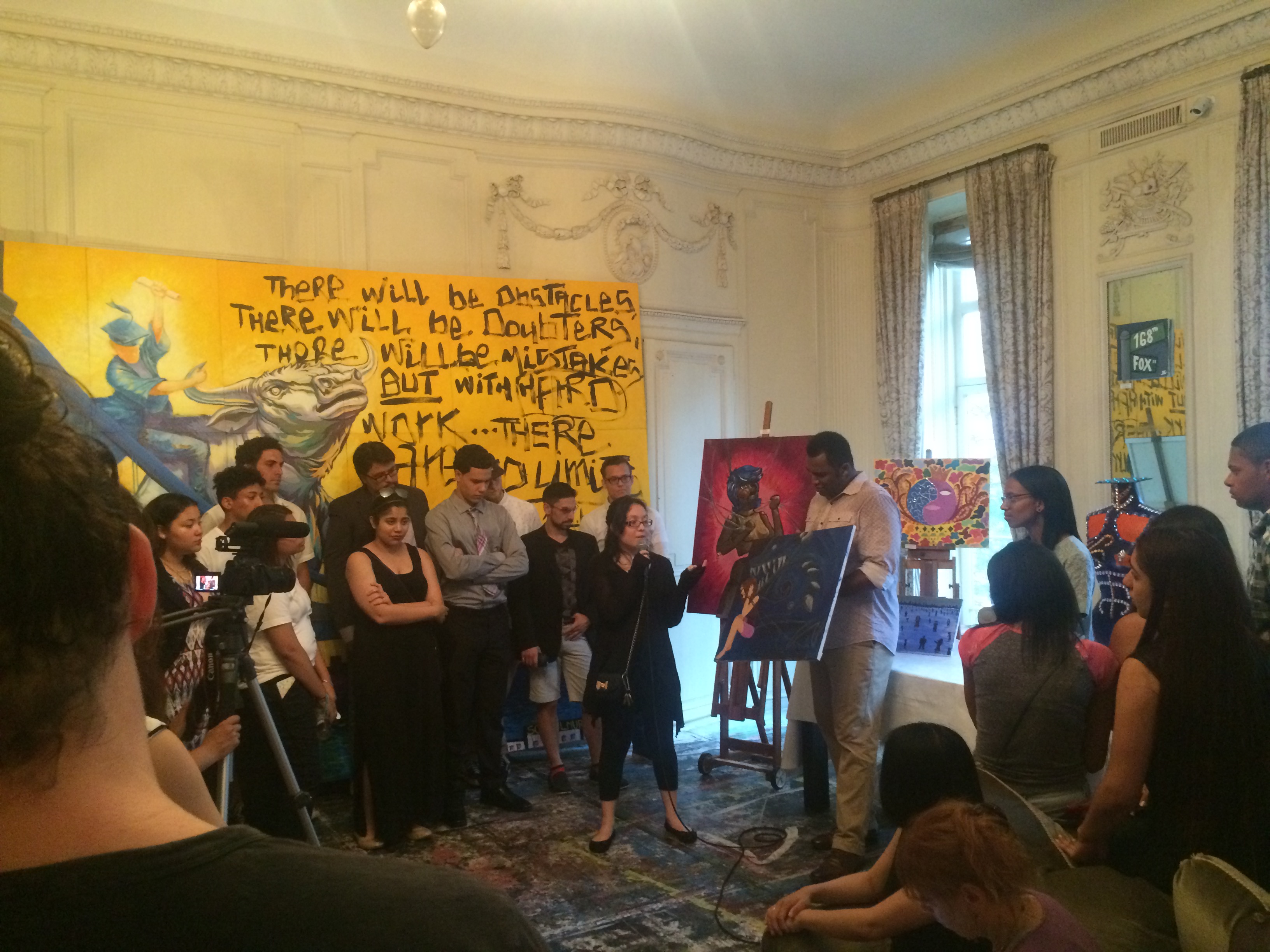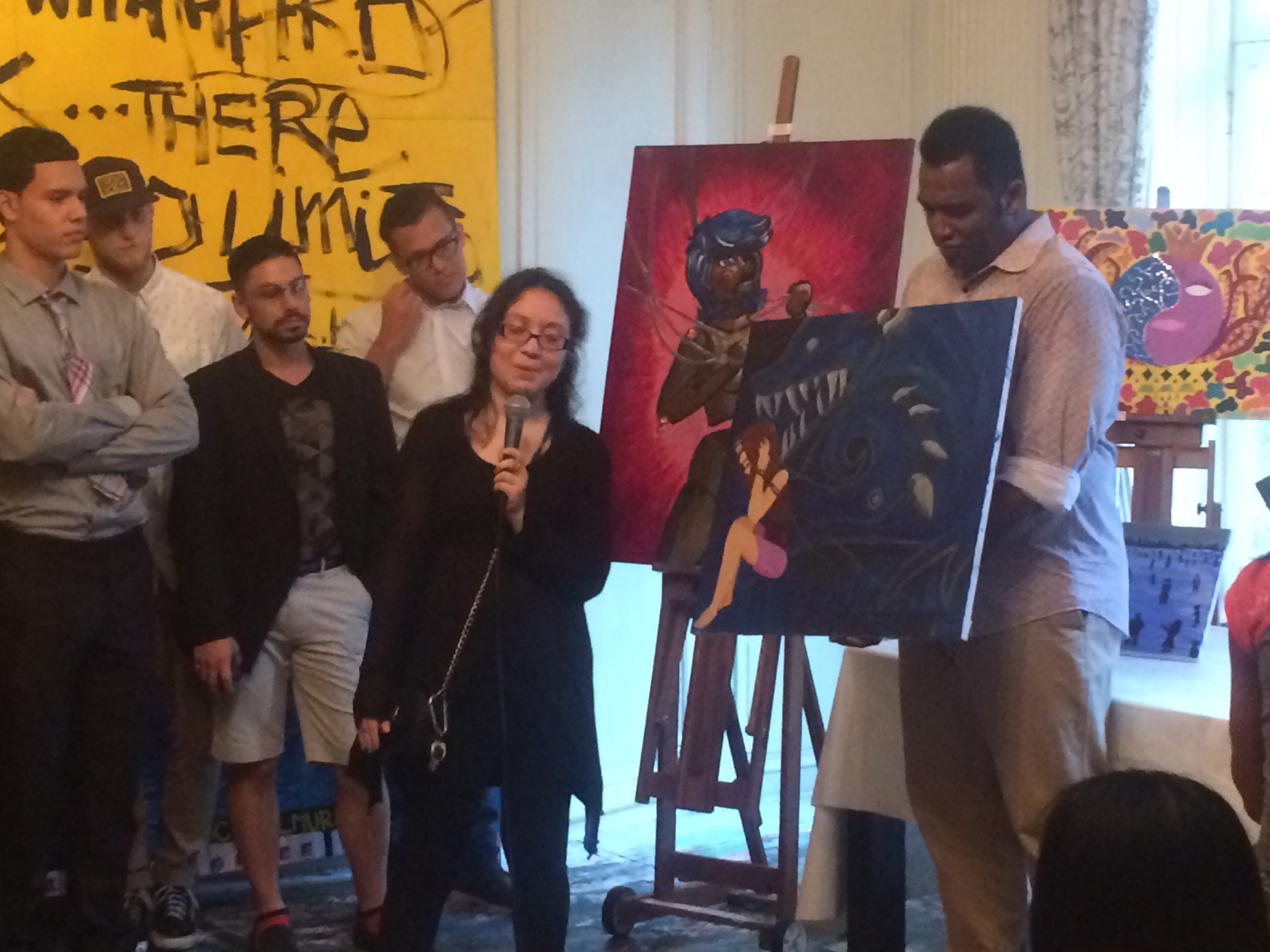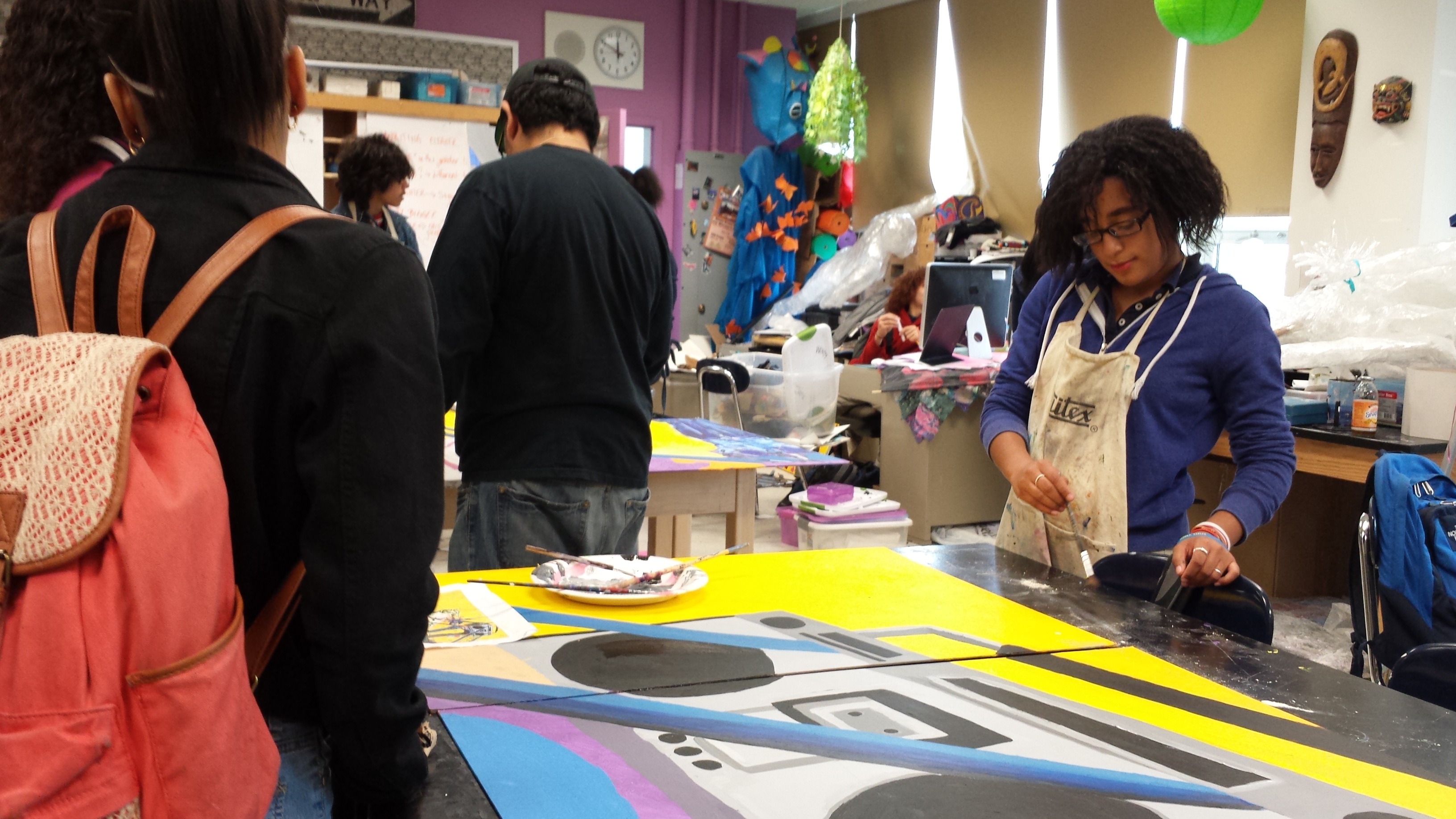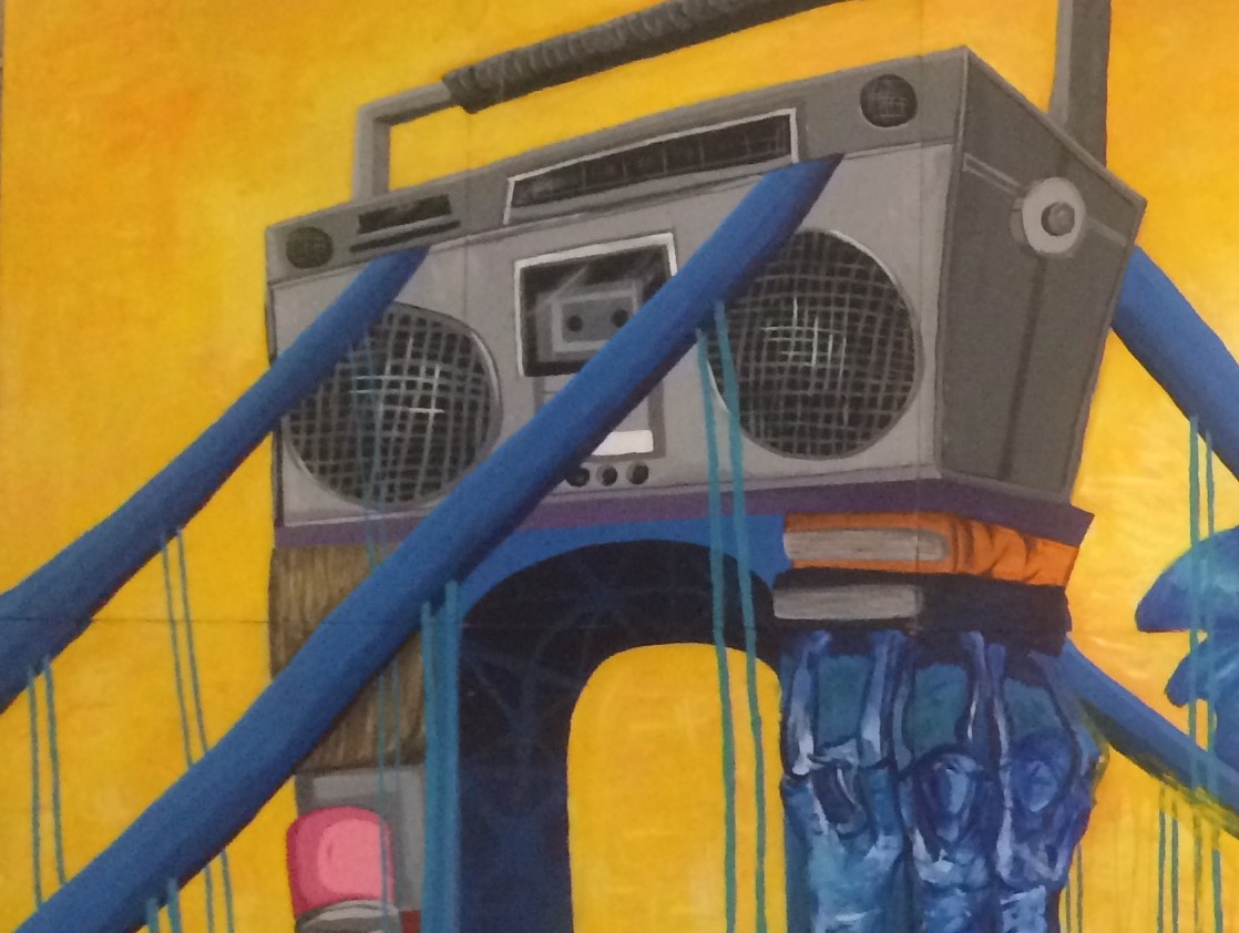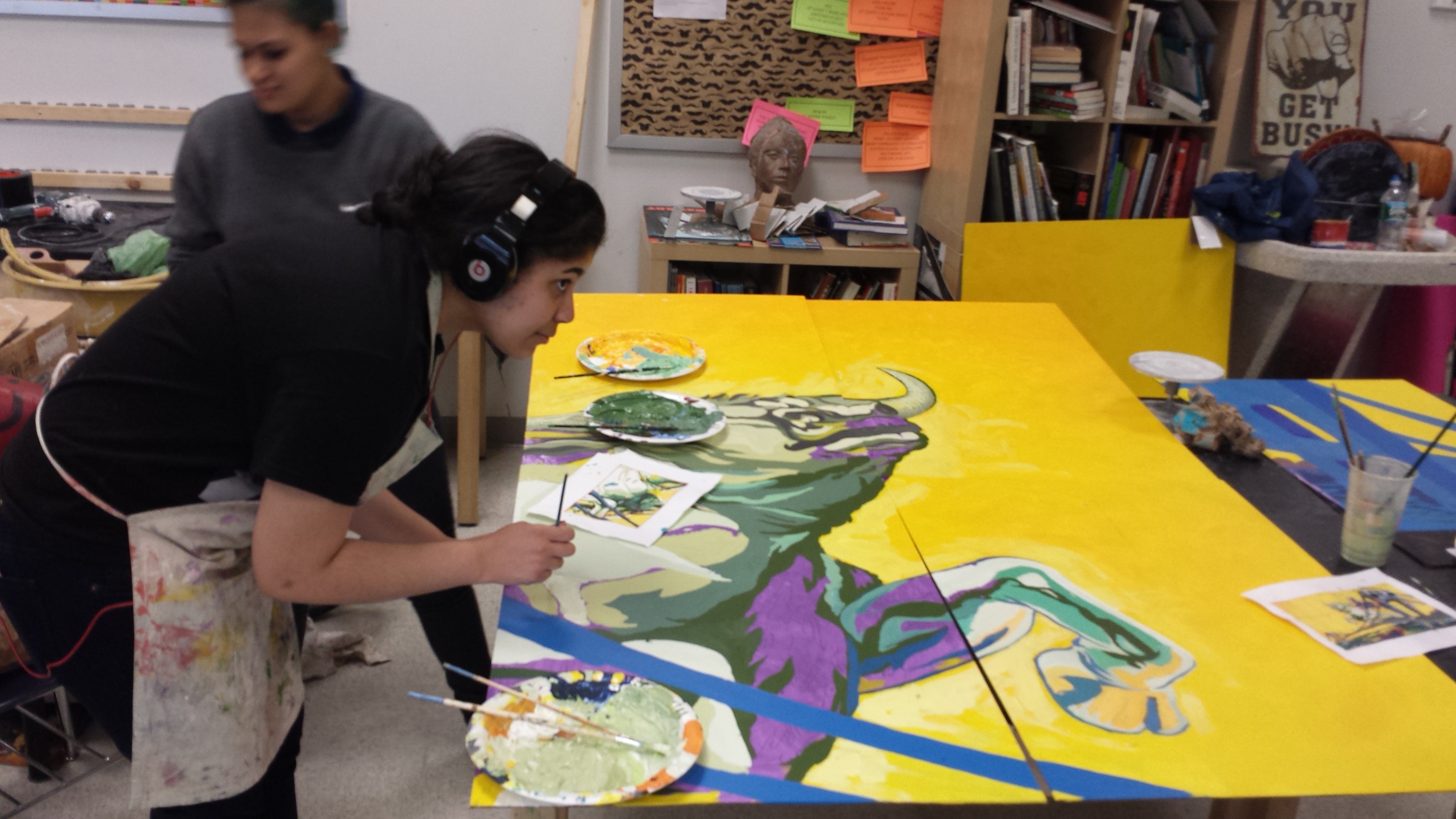 Thrive: Hunts Point Thrive Series (5 of 6) Bronx Studio School for Writers and Artists (Bronx 2015) • Art Direction: Domingo Zapata • Teaching Artist: Sam Wisneski • Main stairwell • 120 square feet • Acrylic on Gessobord • Conceived, designed, and produced by Mural: Master Class students • Sponsored by NYC Council Member Maria del Carmen Arroyo, Elevate NYC, Domingo Zapata Studios, and Turkey Hill