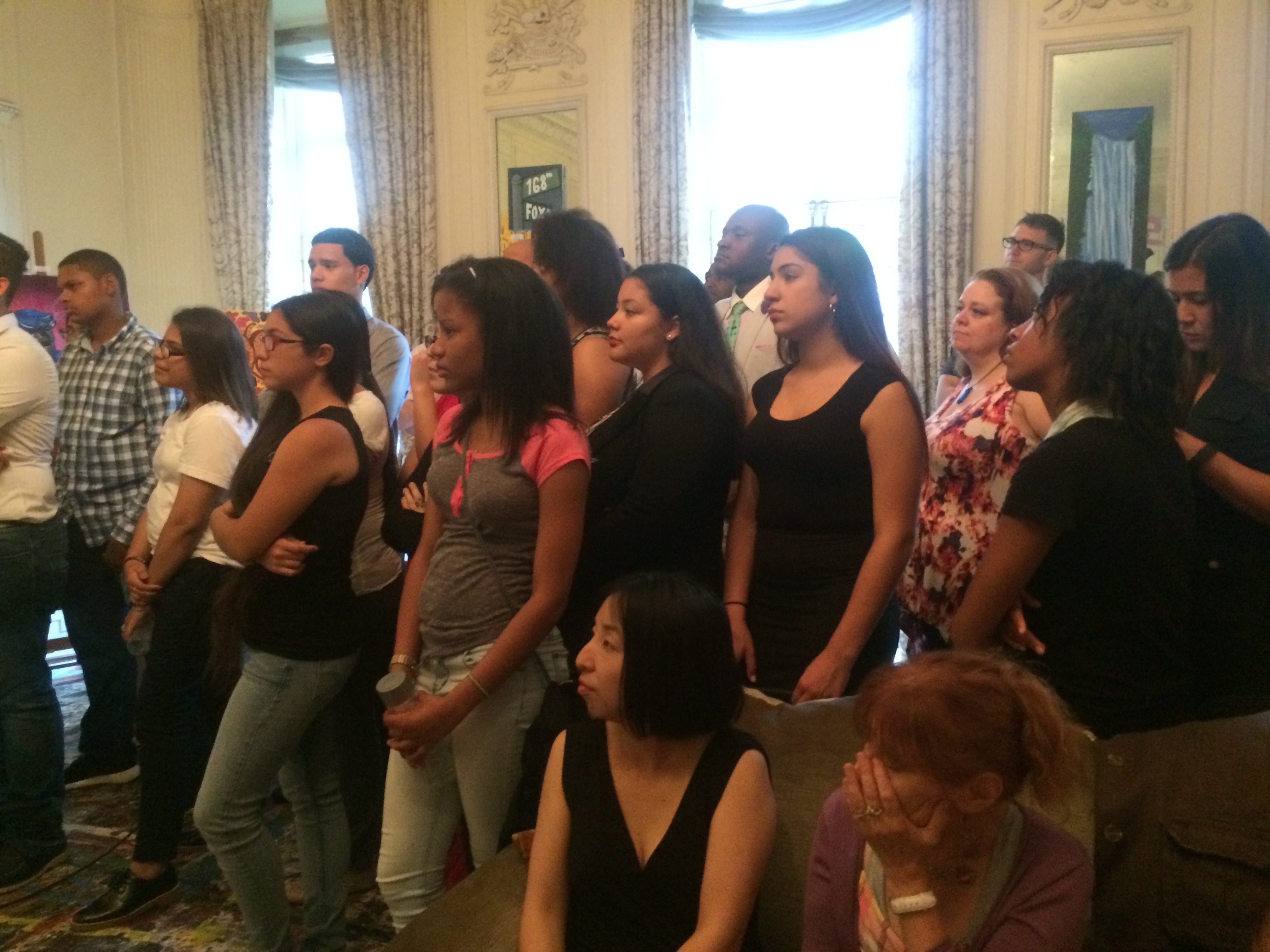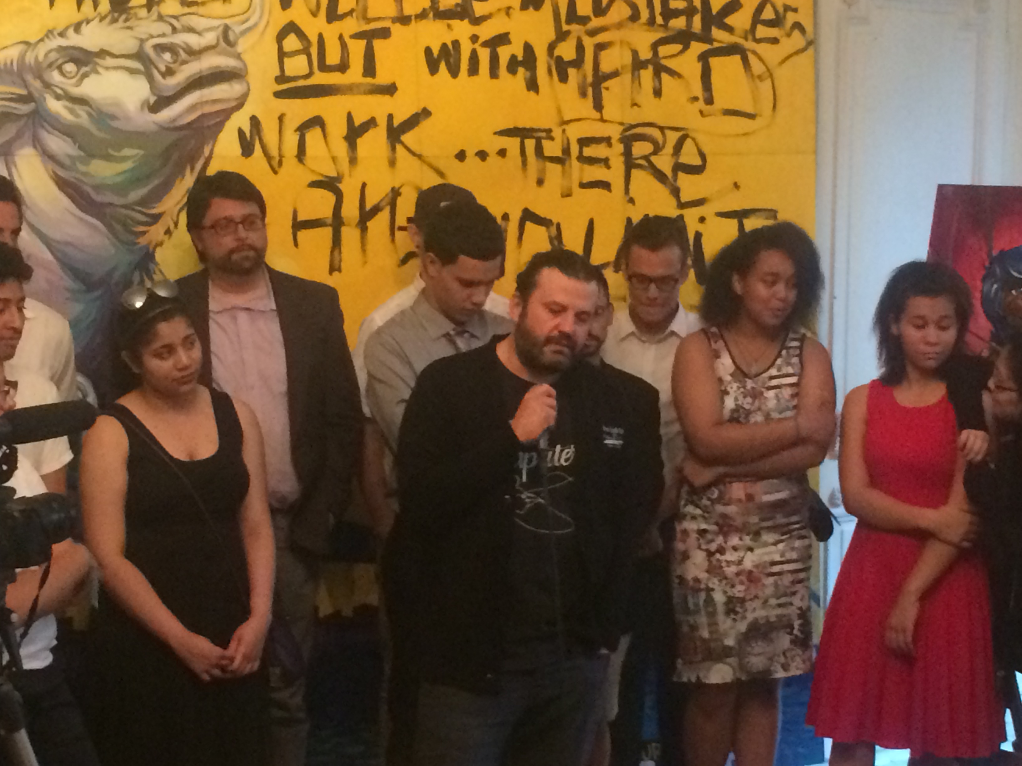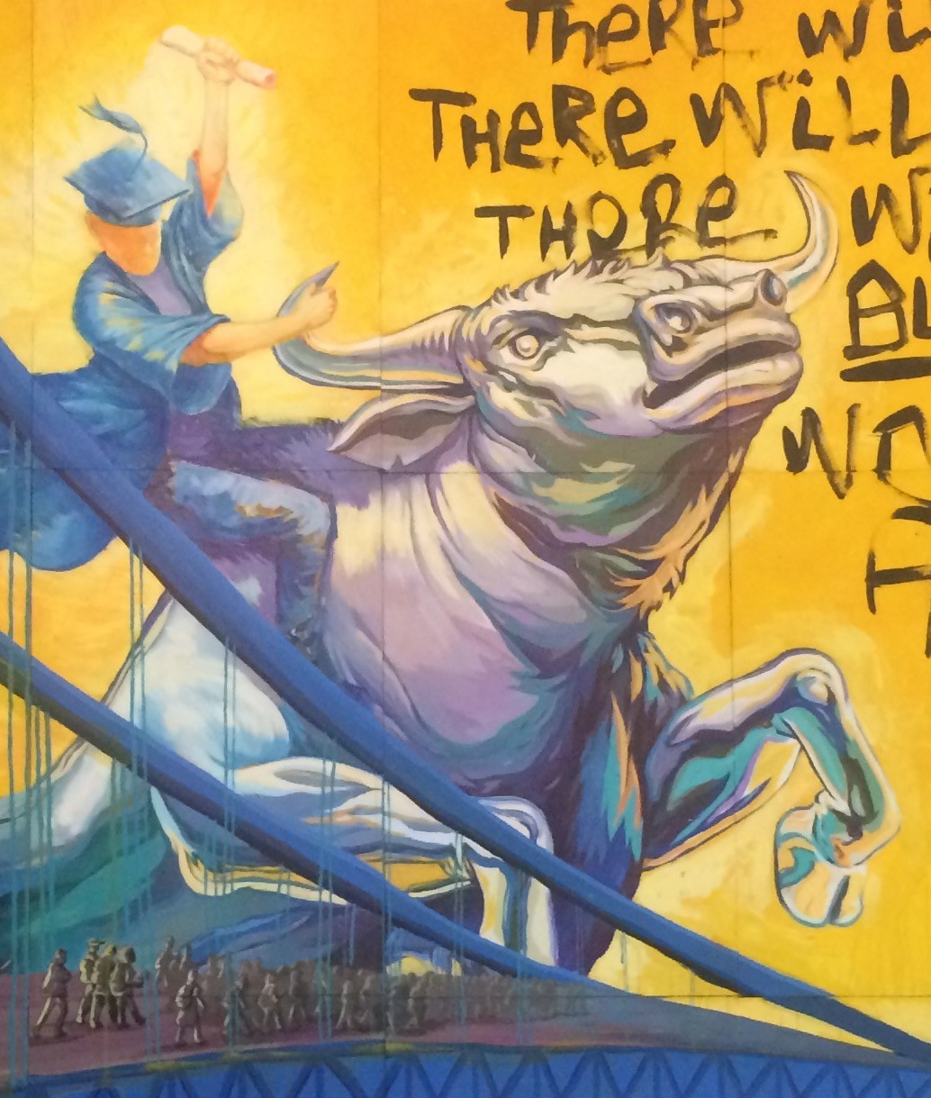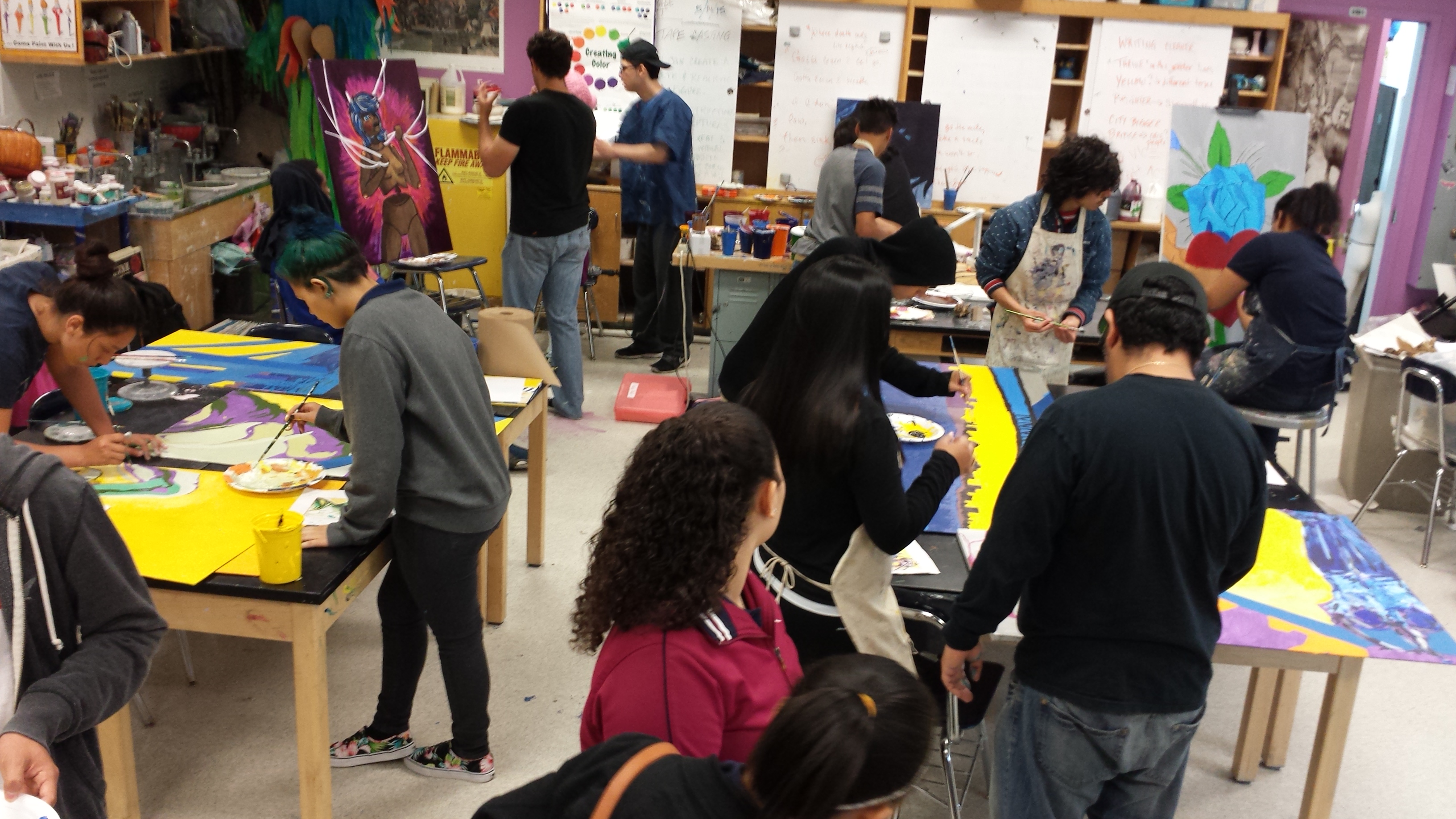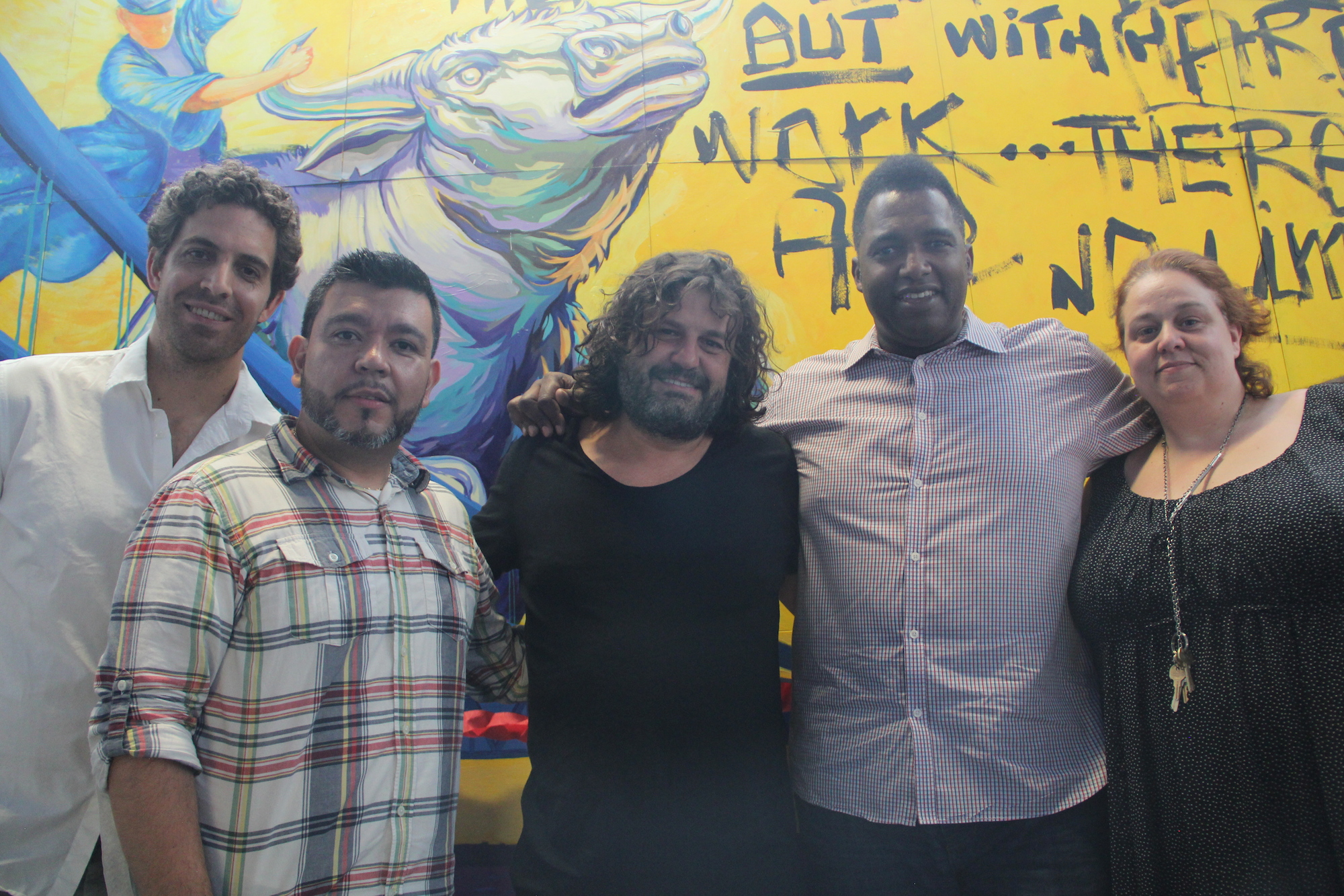 Thrive: Hunts Point Thrive Series (5 of 6) Bronx Studio School for Writers and Artists (Bronx 2015) • Art Direction: Domingo Zapata • Teaching Artist: Sam Wisneski • Main stairwell • 120 square feet • Acrylic on Gessobord • Conceived, designed, and produced by Mural: Master Class students • Sponsored by NYC Council Member Maria del Carmen Arroyo, Elevate NYC, Domingo Zapata Studios, and Turkey Hill