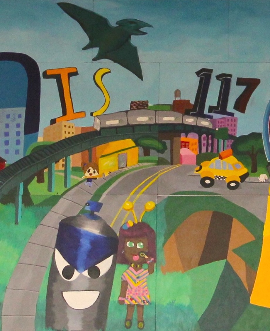 Thrive: Mount Hope Thrive Series (2 of 6) I.S. 117 Joseph Wade (Bronx 2015) • Art Direction & Teaching Artist: Sam Wisneski • Interior auditorium stage • 120 square feet • Acrylic on Gessobord • Thrive: After School art students • Sponsored by: NYC Council Member Fernando Cabrera and Young Life NYC