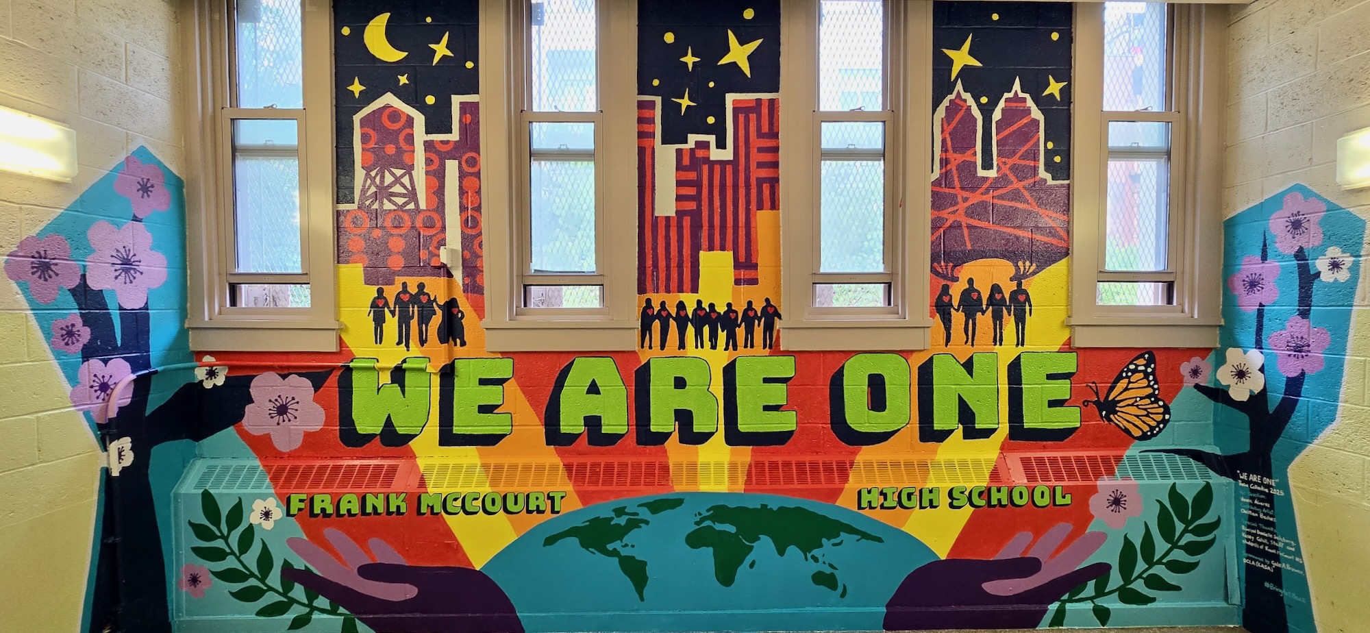 The “WE ARE ONE” mural was created by the students at Frank McCourt High School. During workshops, we explored community and collaboration, covering topics such as cultural roots, kindness, the use of color, and composition.