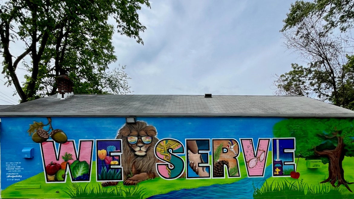 Led by artists Christian Penn and Ryan Mizta, students worked together to develop visuals related to the Lions Club pillars of service. Their motto is “We Serve,” and some of their initiatives that are referenced in the mural include: