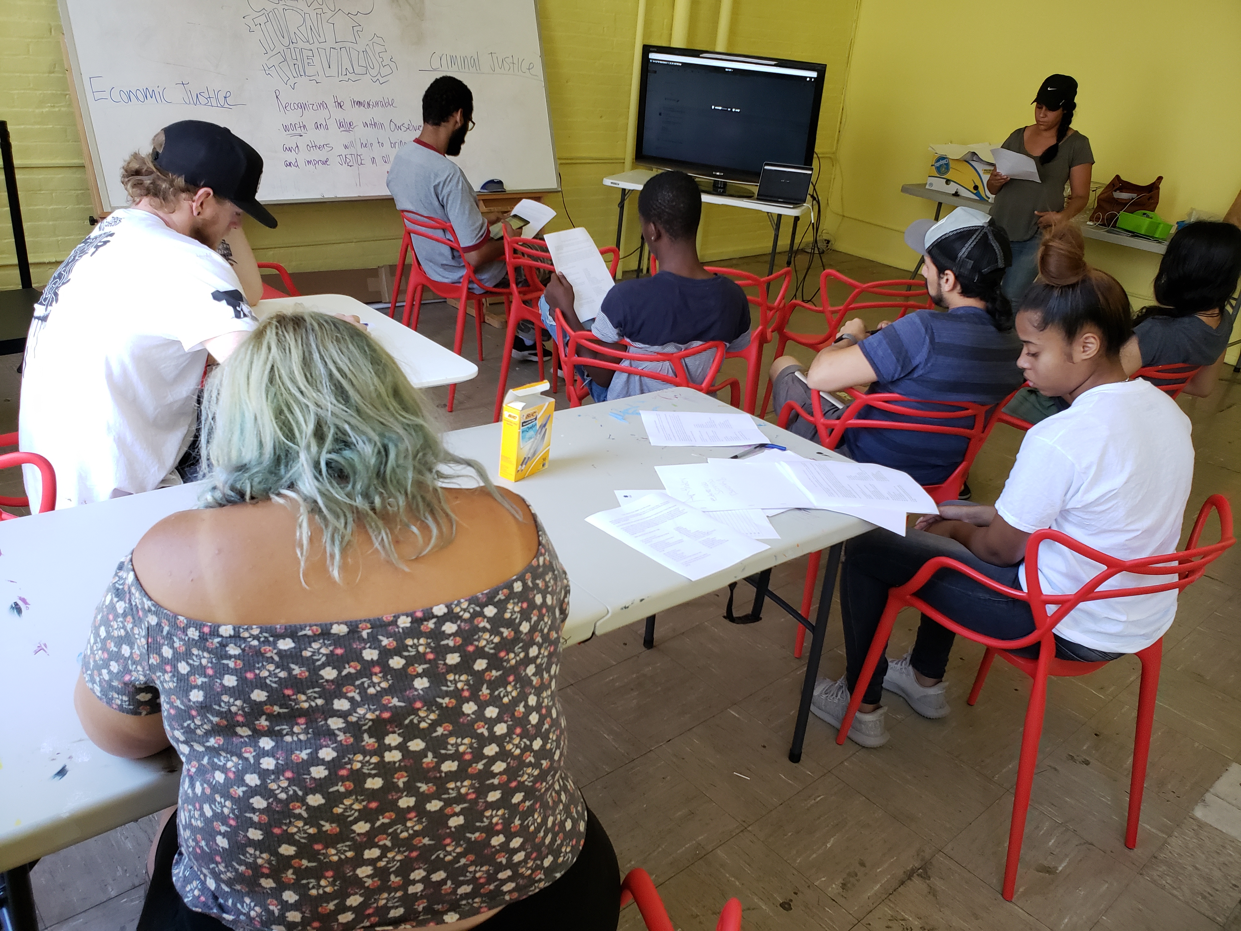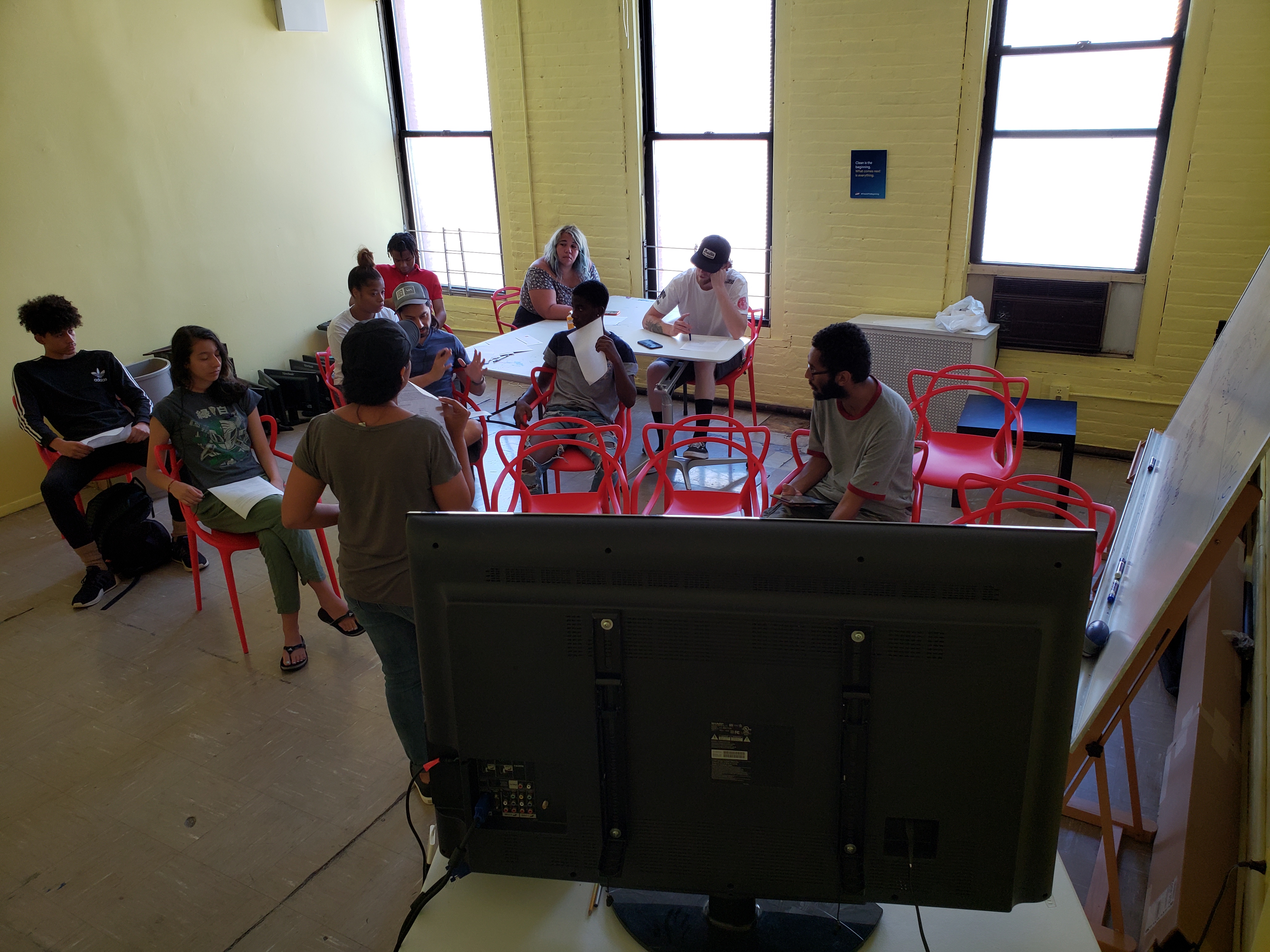 Today is our very first day at the Harlem Hub Summer Arts Academy, and I’m very, very excited! We started off in the media classroom to hear a sneak preview of “Turn Up the Value,” the song we’ll finish writing over the next week. Then we began imagining an upcoming music video for the song, and brainstormed ideas for the new mural we’ll be painting for the second floor of our community hub.