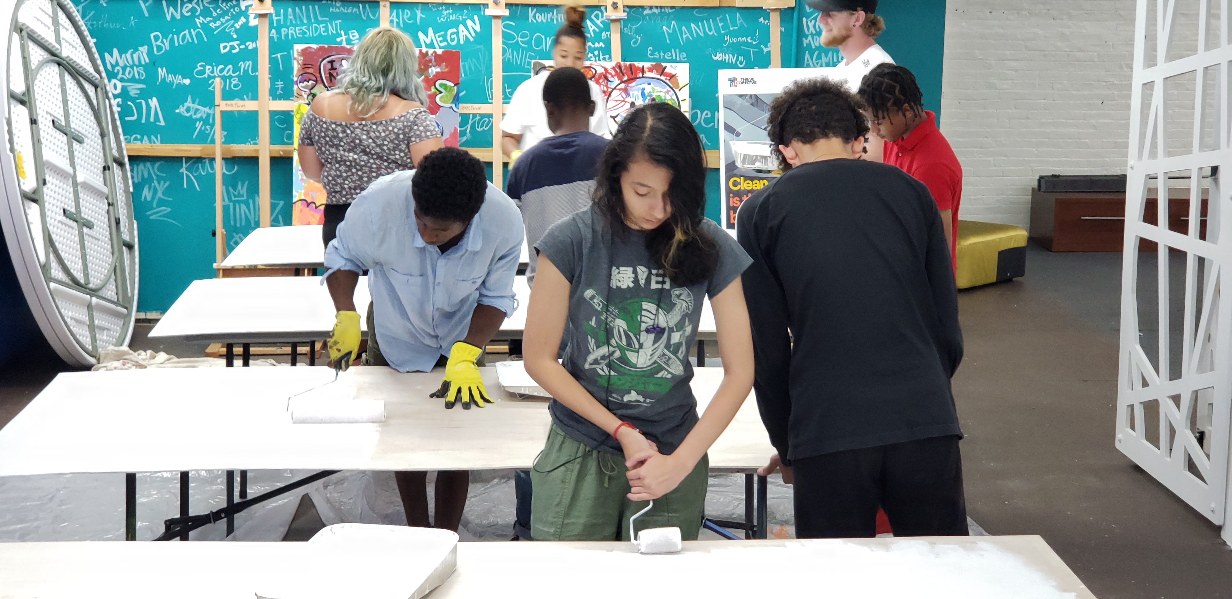 Afterwards we went over to the four boards that we’re going to use for the mural and primed them. While waiting for the primer to dry we took a break sketching our favorite heroes and characters. All in all, it was a very exciting day getting ready for the fun painting we’ll do with our aspiring student painters!